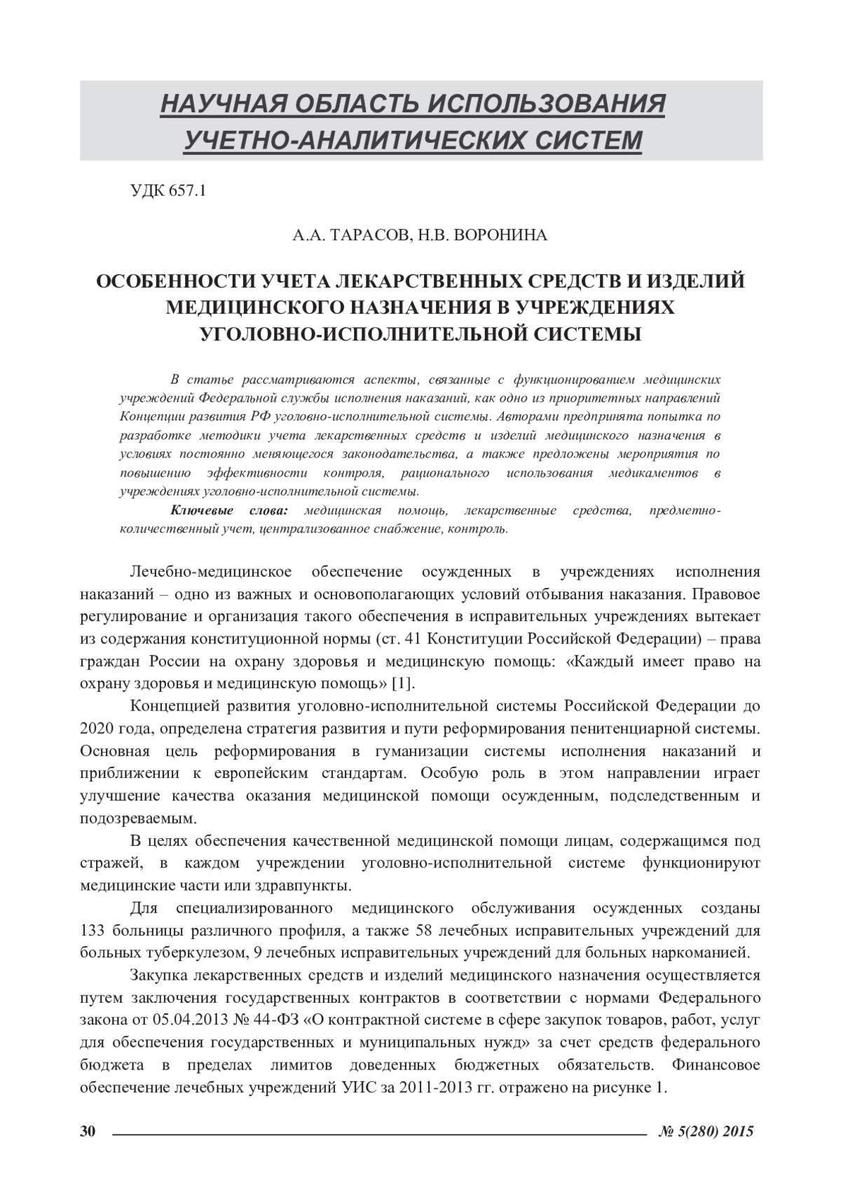 В статье рассматриваются аспекты, связанные с функционированием медицинских учреждений Федеральной службы исполнения наказаний, как одно из приоритетных направлений Концепции развития РФ уголовно-исполнительной системы. Авторами предпринята попытка по разработке методики учета лекарственных средств и изделий медицинского назначения в условиях постоянно меняющегося законодательства, а также предложены мероприятия по повышению эффективности контроля, рационального использования медикаментов в учреждениях уголовно-исполнительной системы