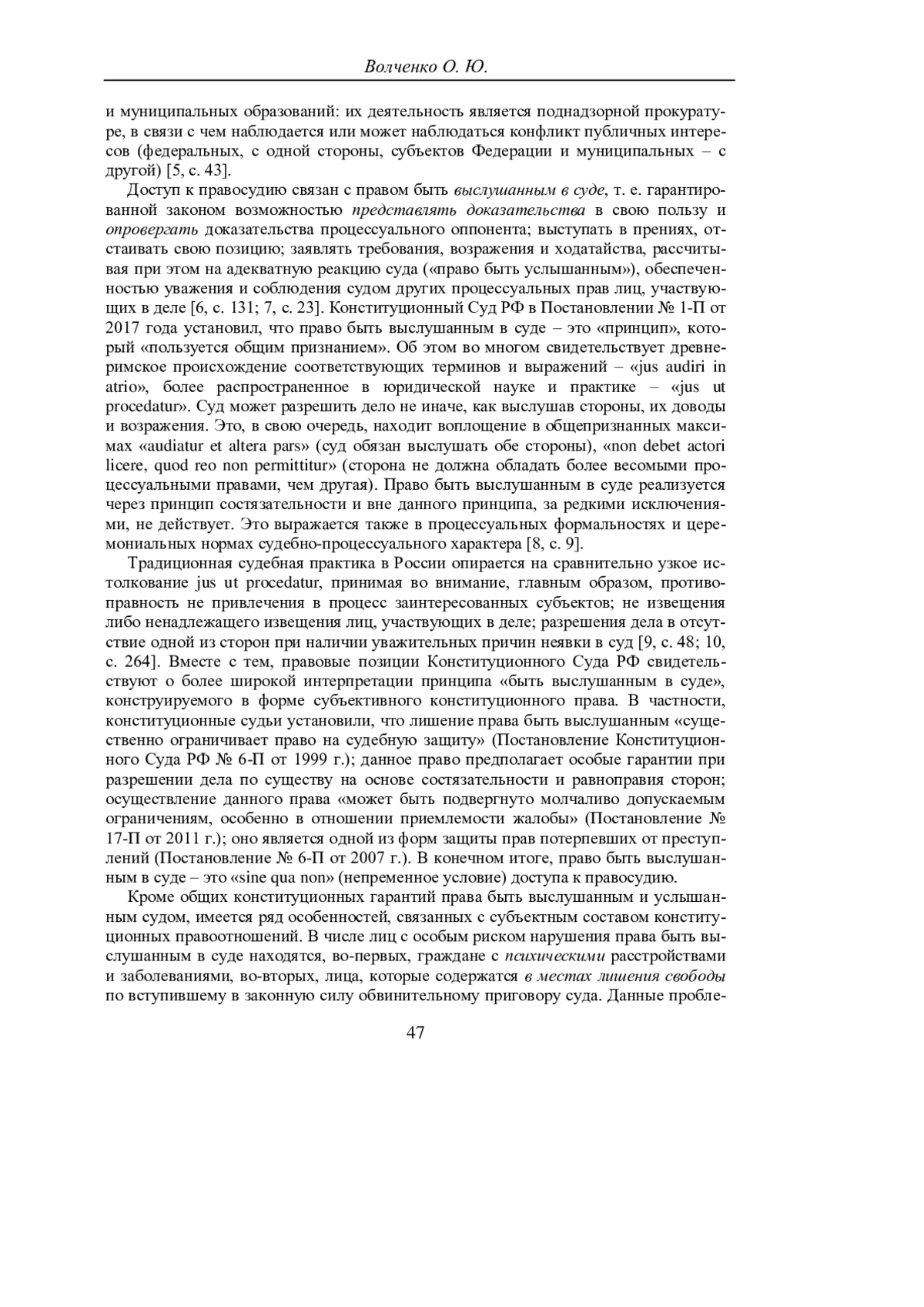 В статье исследуется ряд проблем, связанных с совершенствованием механизма доступа к правосудию в современной России. Автор обосновывает точку зрения, что традиционная судебная практика в России опирается на сравнительно узкое истолкование jus ut procedatur, принимая во внимание, главным образом, противоправность не привлечения в процесс заинтересованных субъектов; не извещения либо ненадлежащего извещения лиц, участвующих в деле; разрешения дела в отсутствие одной из сторон при наличии уважительных причин неявки в суд. Вместе с тем, правовые позиции Конституционного Суда РФ свидетельствуют о более широкой интерпретации принципа «быть выслушанным в суде», конструируемого в форме субъективного конституционного права.