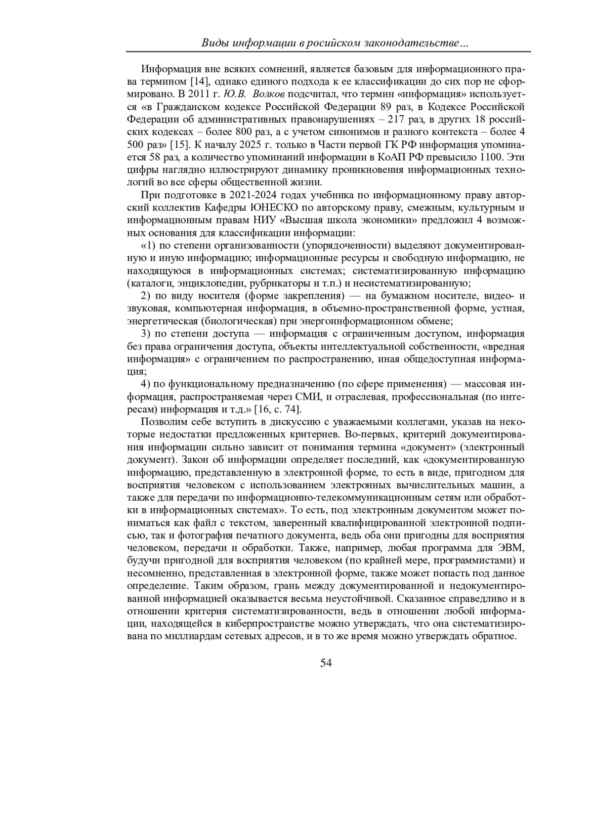 15. Волков Ю.В. Термин “информация” в контексте законодательства // Юрислингвистика. - 2011. -№ 11. - С. 424-426. - Текст: непосредственный. EDN: WCMSWX