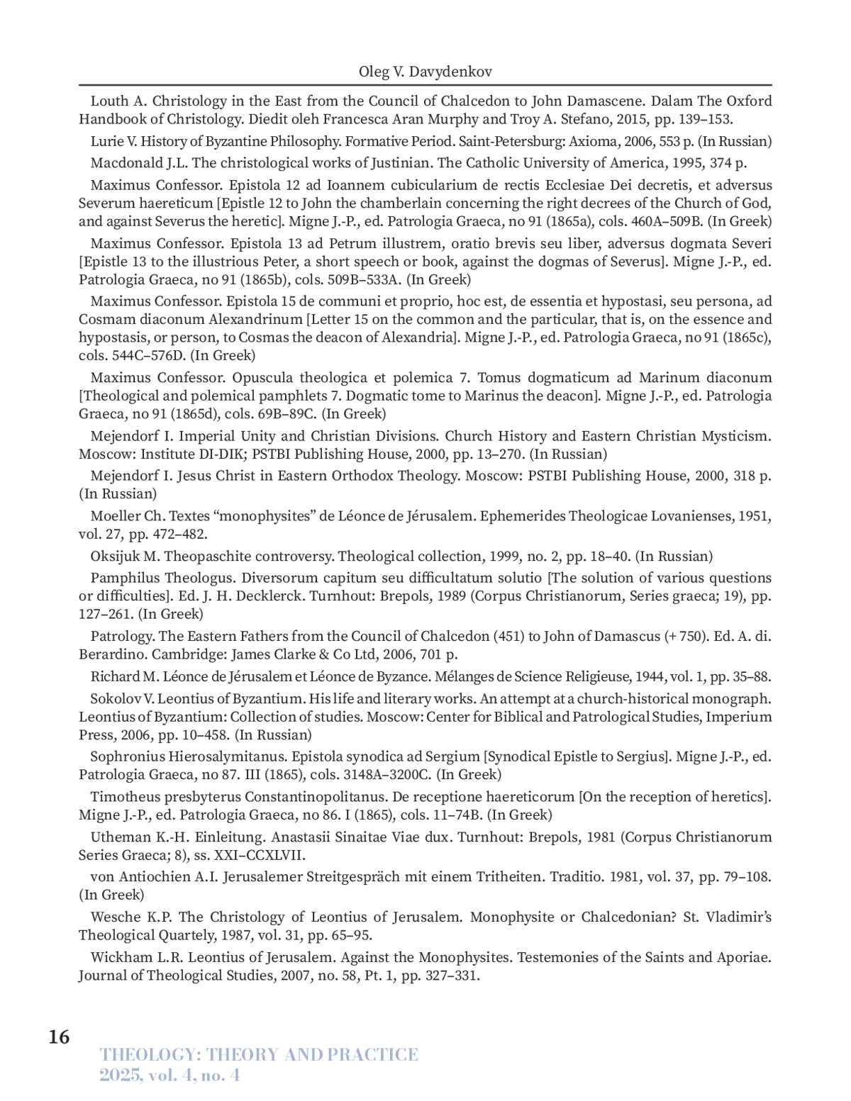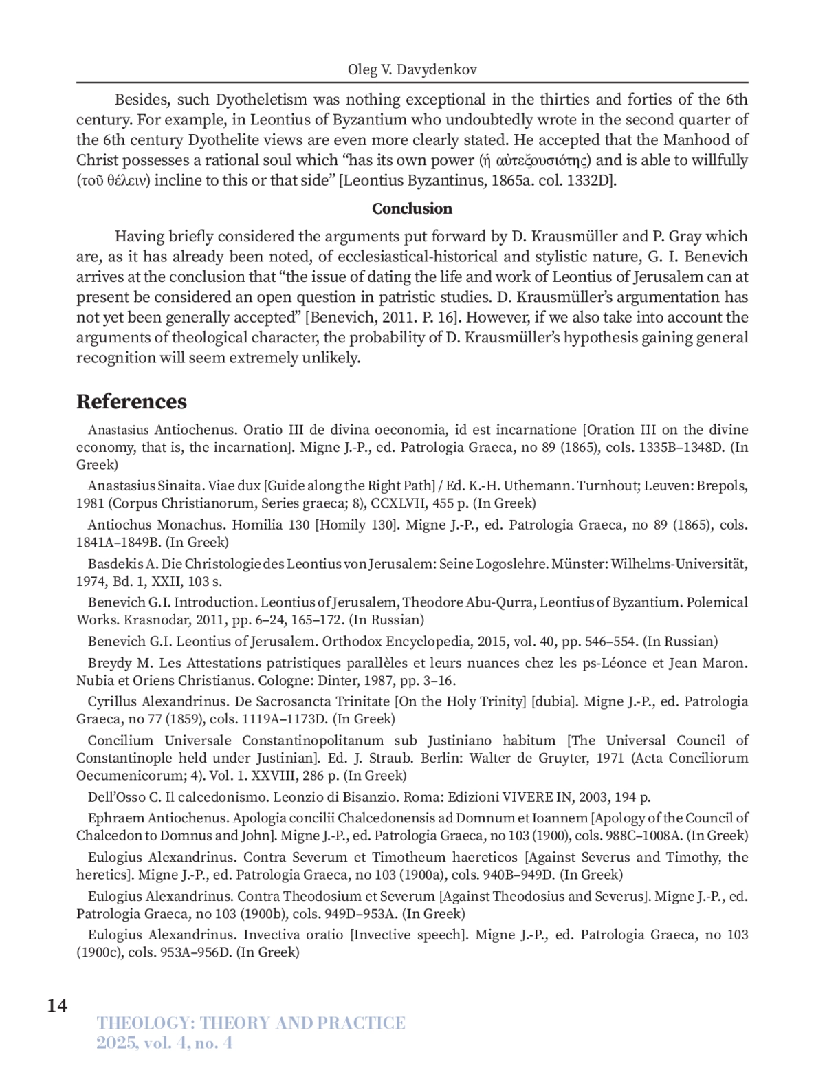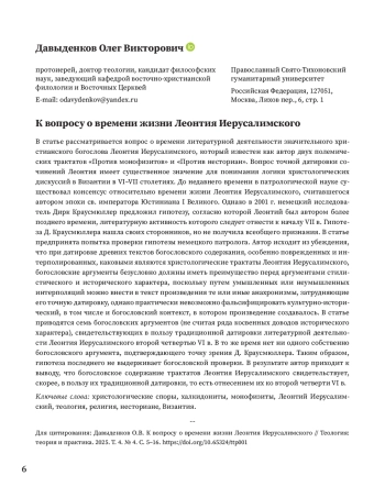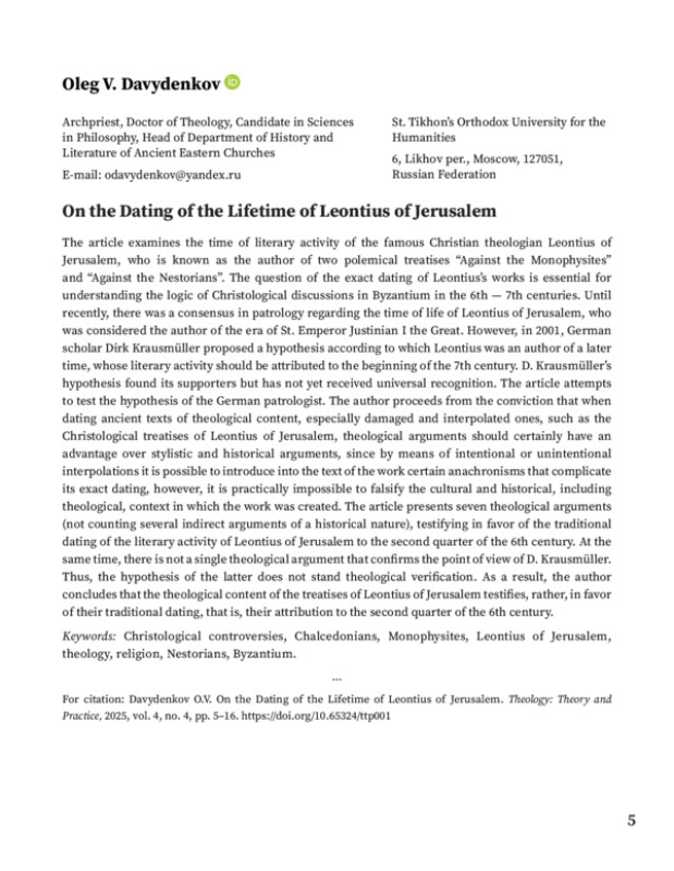 ДАВЫДЕНКОВ О. В. К ВОПРОСУ О ВРЕМЕНИ ЖИЗНИ ЛЕОНТИЯ ИЕРУСАЛИМСКОГО // ТЕОЛОГИЯ: ТЕОРИЯ И ПРАКТИКА. 2025. № 3, ТОМ 4