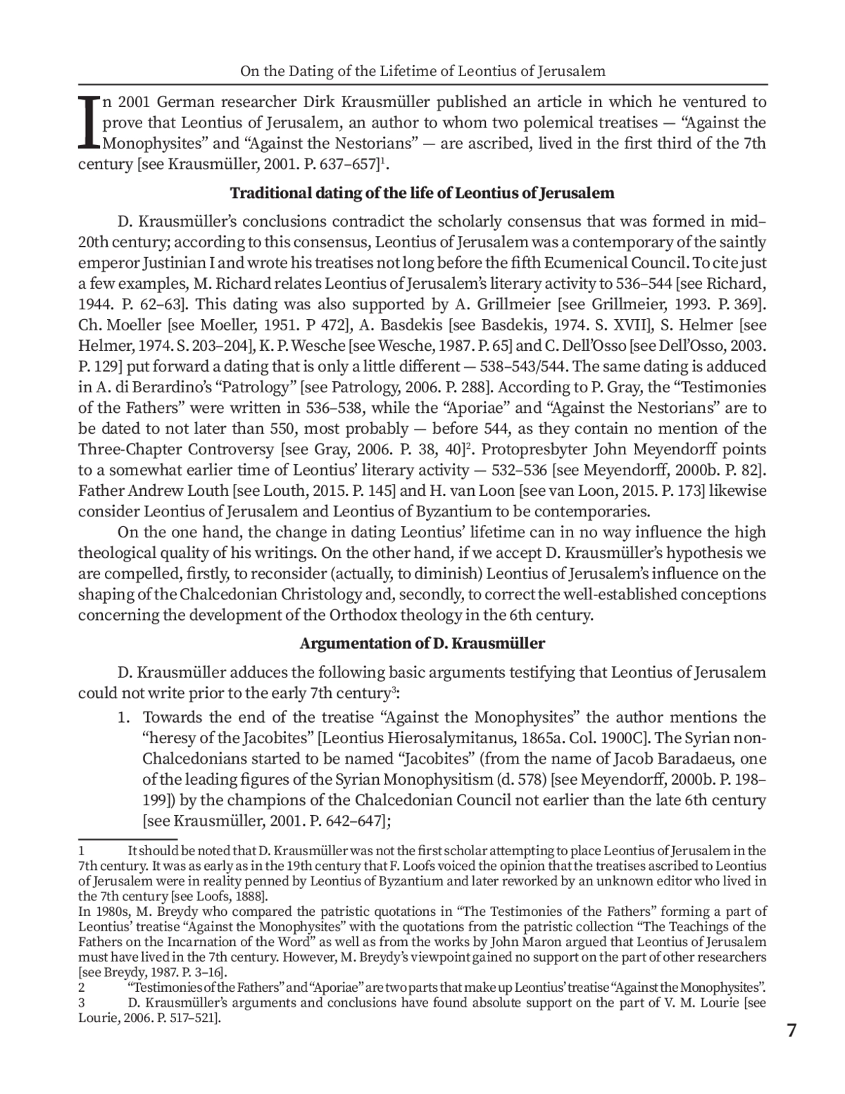 В статье рассматривается вопрос о времени литературной деятельности значительного христианского богослова Леонтия Иерусалимского, который известен как автор двух полемических трактатов «Против монофизитов» и «Против несториан». Вопрос точной датировки сочинений Леонтия имеет существенное значение для понимания логики христологических дискуссий в Византии в VI–VII столетиях. До недавнего времени в патрологической науке существовал консенсус относительно времени жизни Леонтия Иерусалимского, считавшегося автором эпохи св. императора Юстиниана I Великого. Однако в 2001 г. немецкий исследователь Дирк Краусмюллер предложил гипотезу, согласно которой Леонтий был автором более позднего времени, литературную активность которого следует отнести к началу VII в. Гипотеза Д. Краусмюллера нашла своих сторонников, но не получила всеобщего признания. В статье предпринята попытка проверки гипотезы немецкого патролога. Автор исходит из убеждения, что при датировке древних текстов богословского содержания, особенно поврежденных и интерполированных, каковыми являются христологические трактаты Леонтия Иерусалимского, богословские аргументы безусловно должны иметь преимущество перед аргументами стилистического и исторического характера, поскольку путем умышленных или неумышленных интерполяций можно внести в текст произведения те или иные анахронизмы, затрудняющие его точную датировку, однако практически невозможно фальсифицировать культурно-исторический, в том числе и богословский контекст, в котором произведение создавалось. В статье приводятся семь богословских аргументов (не считая ряда косвенных доводов исторического характера), свидетельствующих в пользу традиционной датировки литературной деятельности Леонтия Иерусалимского второй четвертью VI в. В то же время нет ни одного собственно богословского аргумента, подтверждающего точку зрения Д. Краусмюллера. Таким образом, гипотеза последнего не выдерживает богословской проверки. В результате автор приходит к выводу, что богословское содержание трактатов Леонтия Иерусалимского свидетельствует, скорее, в пользу их традиционной датировки, то есть отнесением их ко второй четверти VI в.