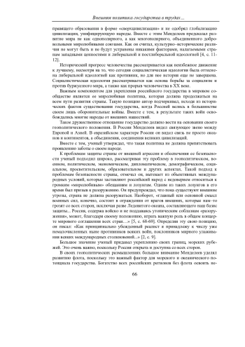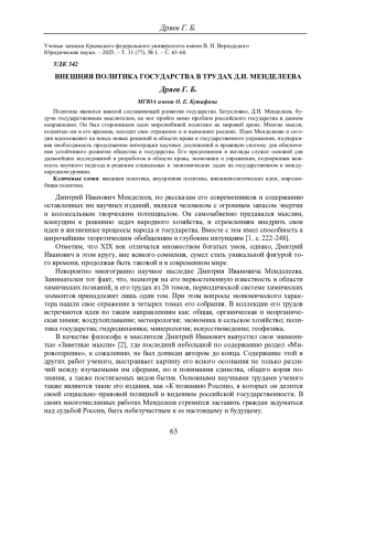 Политика является важной составляющей развития государства. Безусловно, Д. И. Менделеев, будучи государственным мыслителем, не мог пройти мимо проблем российского государства в данном направлении. Он был сторонником идеи миролюбивой политики на мировой арене. Многие мысли, поднятые им в его времена, находят свое отражение и в нынешних реалиях. Идеи Менделеева и сегодня вдохновляют на поиск новых решений в области права и государственного управления, подчеркивая необходимость продолжения интеграции научных достижений в правовую систему для обеспечения устойчивого развития общества и государства. Его предложения и взгляды служат основой для дальнейших исследований и разработок в области права, экономики и управления, подчеркивая важность научного подхода в решении социальных и экономических задач на государственном и международном уровнях.