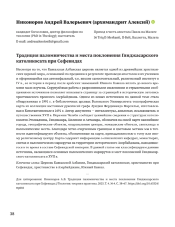 Несмотря на то, что Кавказская Албанская церковь является одной из древнейших христианских церквей мира, основанной по преданию в результате проповеди апостолов и их учеников и оформившейся как автокефальный, т. е. вполне самостоятельный, религиозный институт в IV в., ее история в период после арабских завоеваний Южного Кавказа вплоть до нового времени мало изучена. Скрупулёзная работа с разрозненными сведениями и отрывочными сообщениями источников позволяет вписывать страницу за страницей в историческую летопись христианского прошлого Азербайджана. Одним из новых источников по данной теме стала обнаруженная в 1991 г. в библиотечных архивах Болонского Университета топографическая карта из коллекции восточных рукописей графа Луиджи Фердинандо Марсильи, изготовленная в Константинополе в 1691 г. Автор документа — интеллектуал, дипломат, исследователь и путешественник XVII в. Иеремия Челеби сообщает ценнейшие сведения о структурах католикосатов Эчмиадзина, Гянджасара, Киликии и Ахтамара, обозначив на своей карте важнейшие города, географические объекты, епархиальные центры, монашеские обители, святилища и паломнические места. Благодаря четко очерченным границам и цветовым меткам мы в точности идентифицируем объекты, обозначенные на карте, принадлежностью к тому или иному религиозному центру. Карта содержит информацию о епископских кафедрах, монастырях, скитах и паломнических маршрутах на территории исторического Азербайджана, находившегося в то время в составе Сефевидской империи. В данной статье мы классифицируем данные источника, касающиеся основных паломнических маршрутов и мест поклонений Гянджасарского католикосата в XVII в.