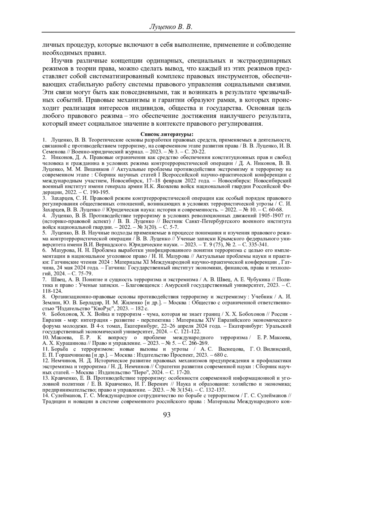 1. Луценко, В. В. Теоретические основы разработки правовых средств, применяемых в деятельности, связанной с противодействием терроризму, на современном этапе развития права / В. В. Луценко, И. В. Семенова // Военно-юридический журнал. - 2023. - № 3. - С. 20-22. EDN: MNXQZY
