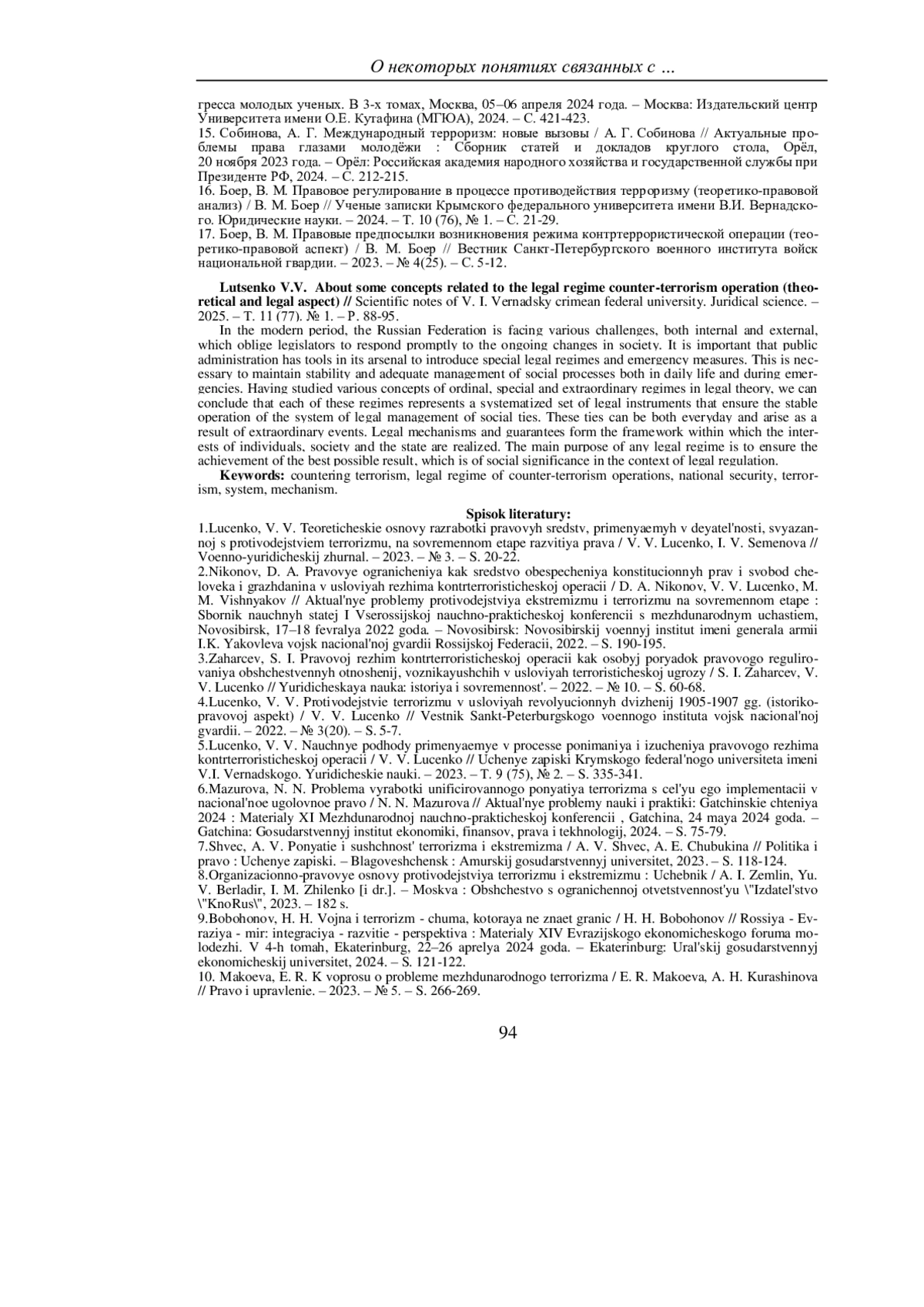 3. Захарцев, С. И. Правовой режим контртеррористической операции как особый порядок правового регулирования общественных отношений, возникающих в условиях террористической угрозы / С. И. Захарцев, В. В. Луценко // Юридическая наука: история и современность. - 2022. - № 10. - С. 60-68. EDN: DQTYYA