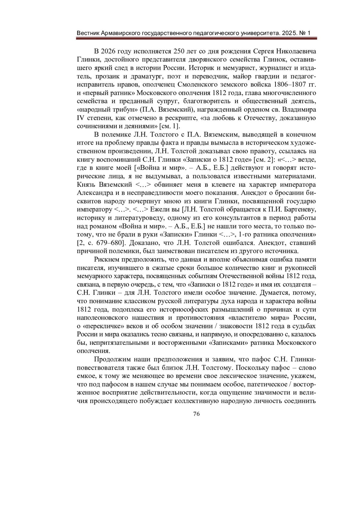 В 2026 году исполняется 250 лет со дня рождения Сергея Николаевича Глинки, достойного представителя дворянского семейства Глинок, оставившего яркий след в истории России. Историк и мемуарист, журналист и издатель, прозаик и драматург, поэт и переводчик, майор гвардии и педагогисправитель нравов, ополченец Смоленского земского войска 1806–1807 гг. и «первый ратник» Московского ополчения 1812 года, глава многочисленного семейства и преданный супруг, благотворитель и общественный деятель, «народный трибун» (П. А. Вяземский), награжденный орденом св. Владимира IV степени, как отмечено в рескрипте, «за любовь к Отечеству, доказанную сочинениями и деяниями» [см. 1].
