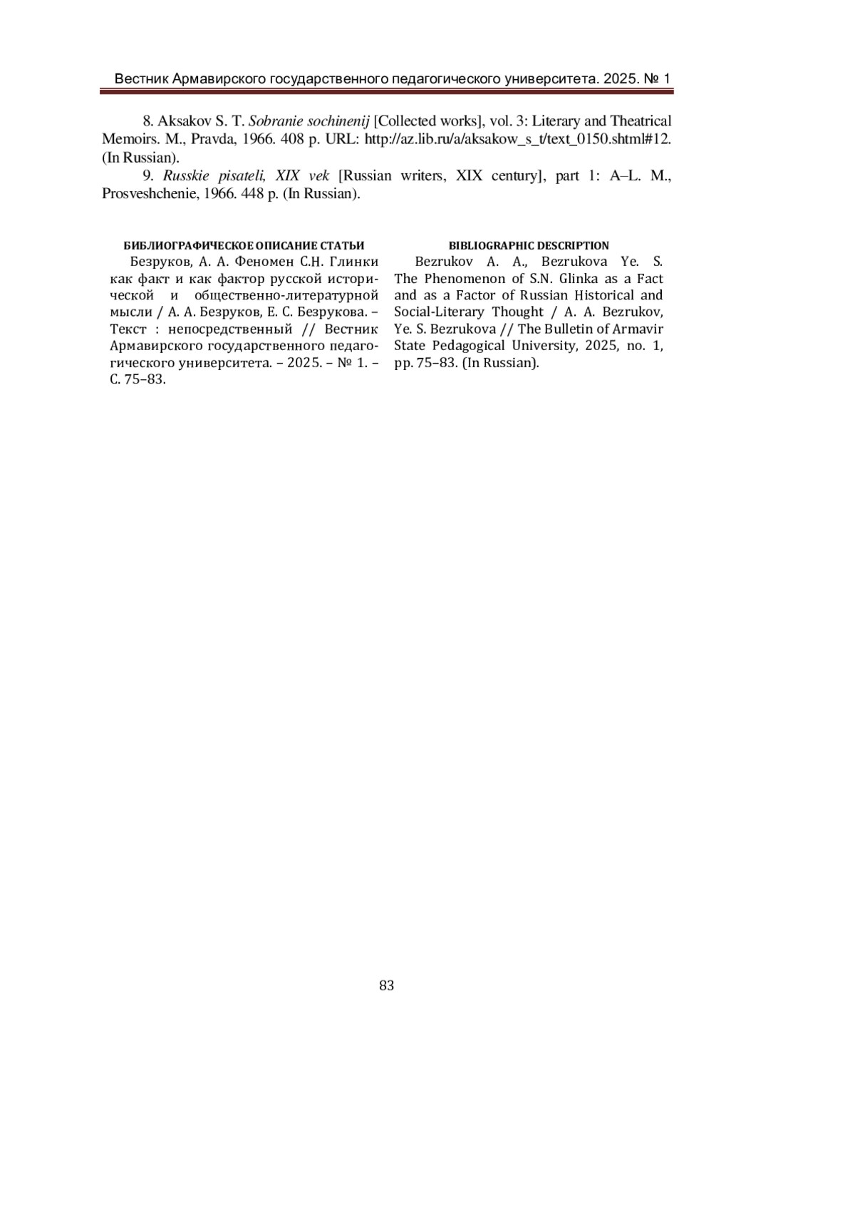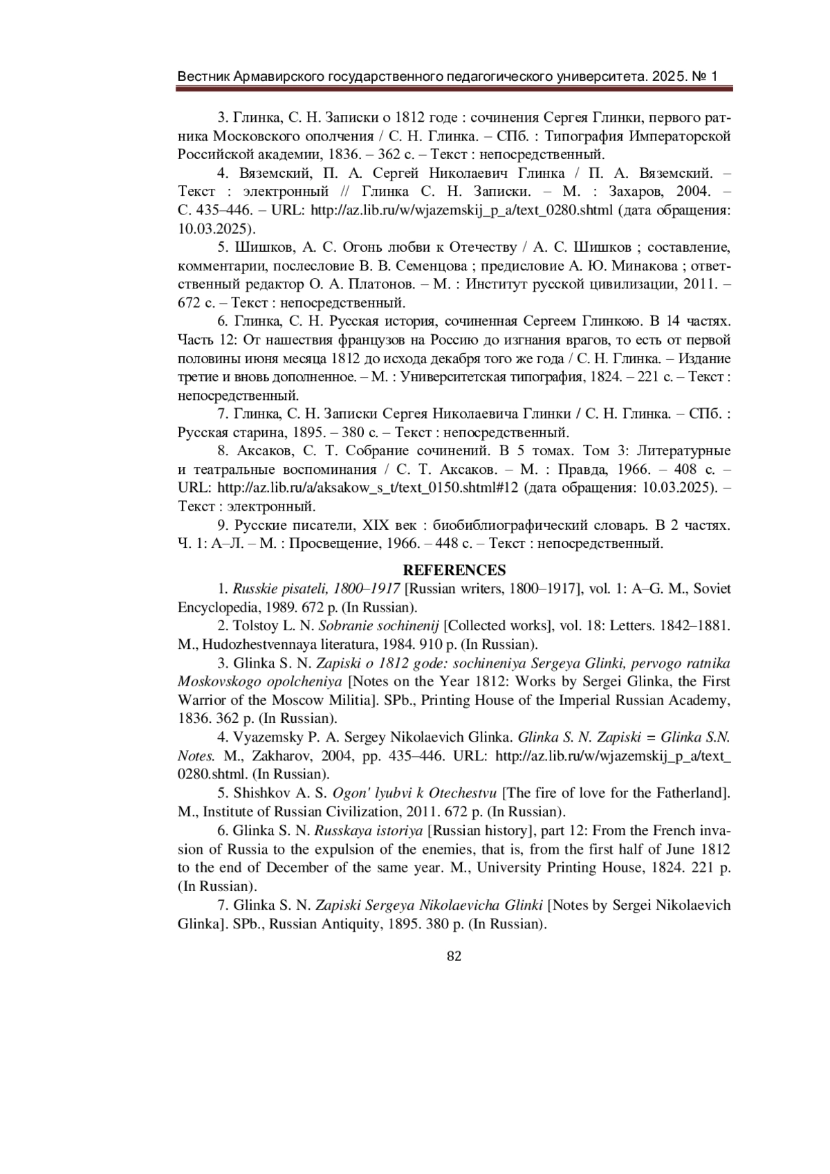 4. Вяземский, П. А. Сергей Николаевич Глинка / П. А. Вяземский. - Текст: электронный // Глинка С. Н. Записки. - М.: Захаров, 2004. - С. 435-446. - URL: http://az.lib.ru/w/wjazemskij_p_a/text_0280.shtml (дата обращения: 10.03.2025).