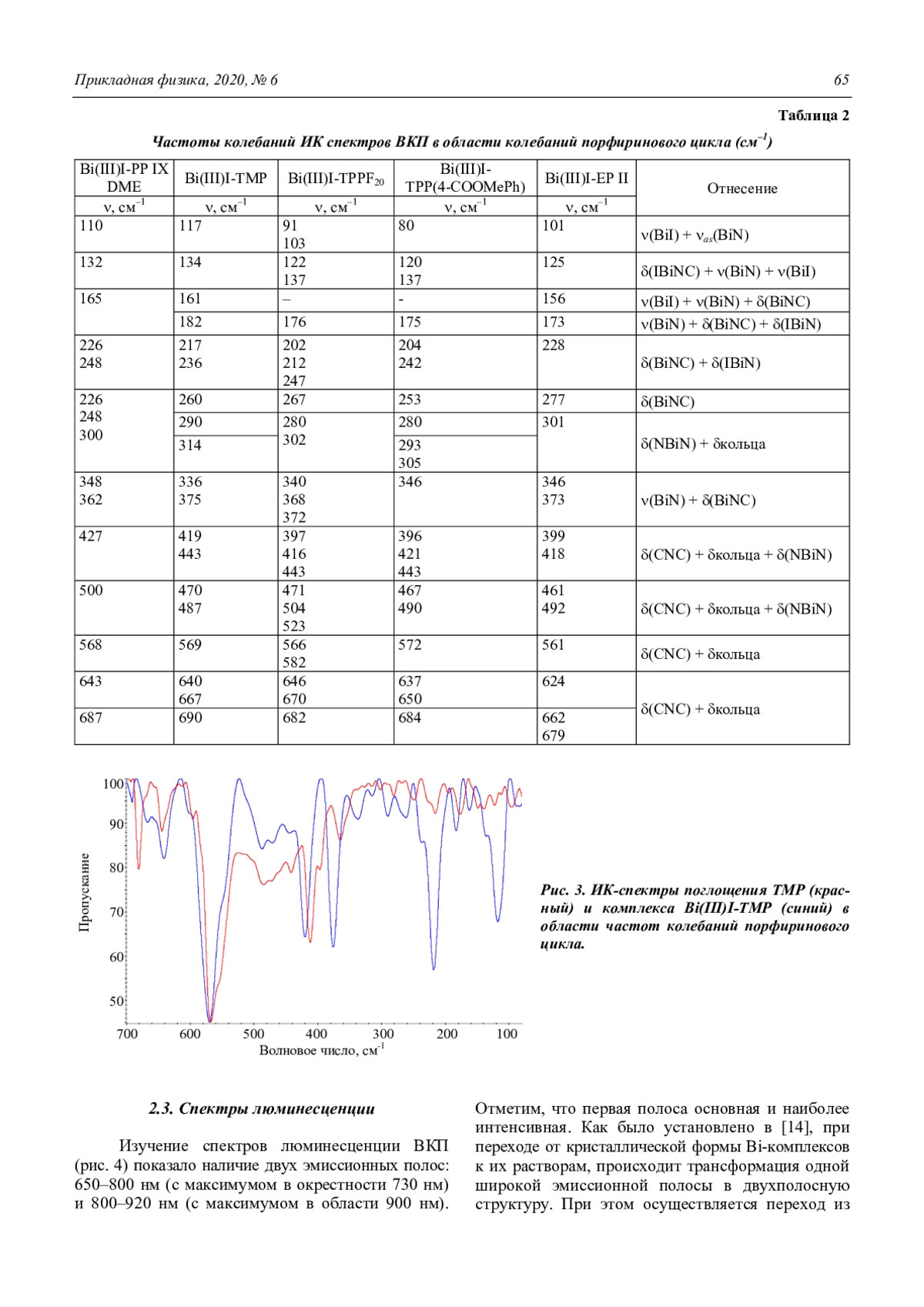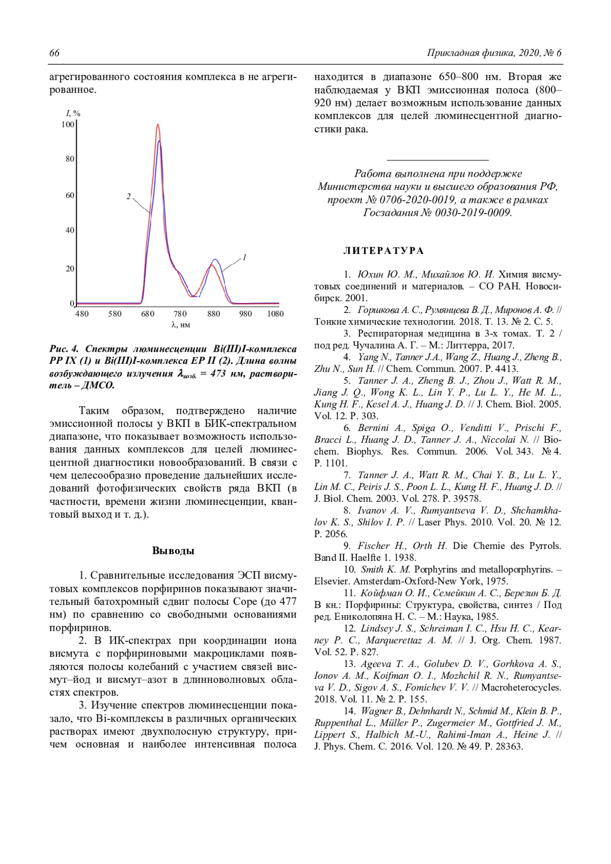 1. Сравнительные исследования ЭСП висмутовых комплексов порфиринов показывают значительный батохромный сдвиг полосы Соре (до 477 нм) по сравнению со свободными основаниями порфиринов. 2. В ИК-спектрах при координации иона висмута с порфириновыми макроциклами появляются полосы колебаний с участием связей висмут–йод и висмут–азот в длинноволновых областях спектров. 3. Изучение спектров люминесценции показало, что Bi-комплексы в различных органических растворах имеют двухполосную структуру, причем основная и наиболее интенсивная полоса находится в диапазоне 650–800 нм. Вторая же наблюдаемая у ВКП эмиссионная полоса (800– 920 нм) делает возможным использование данных комплексов для целей люминесцентной диагностики рака.