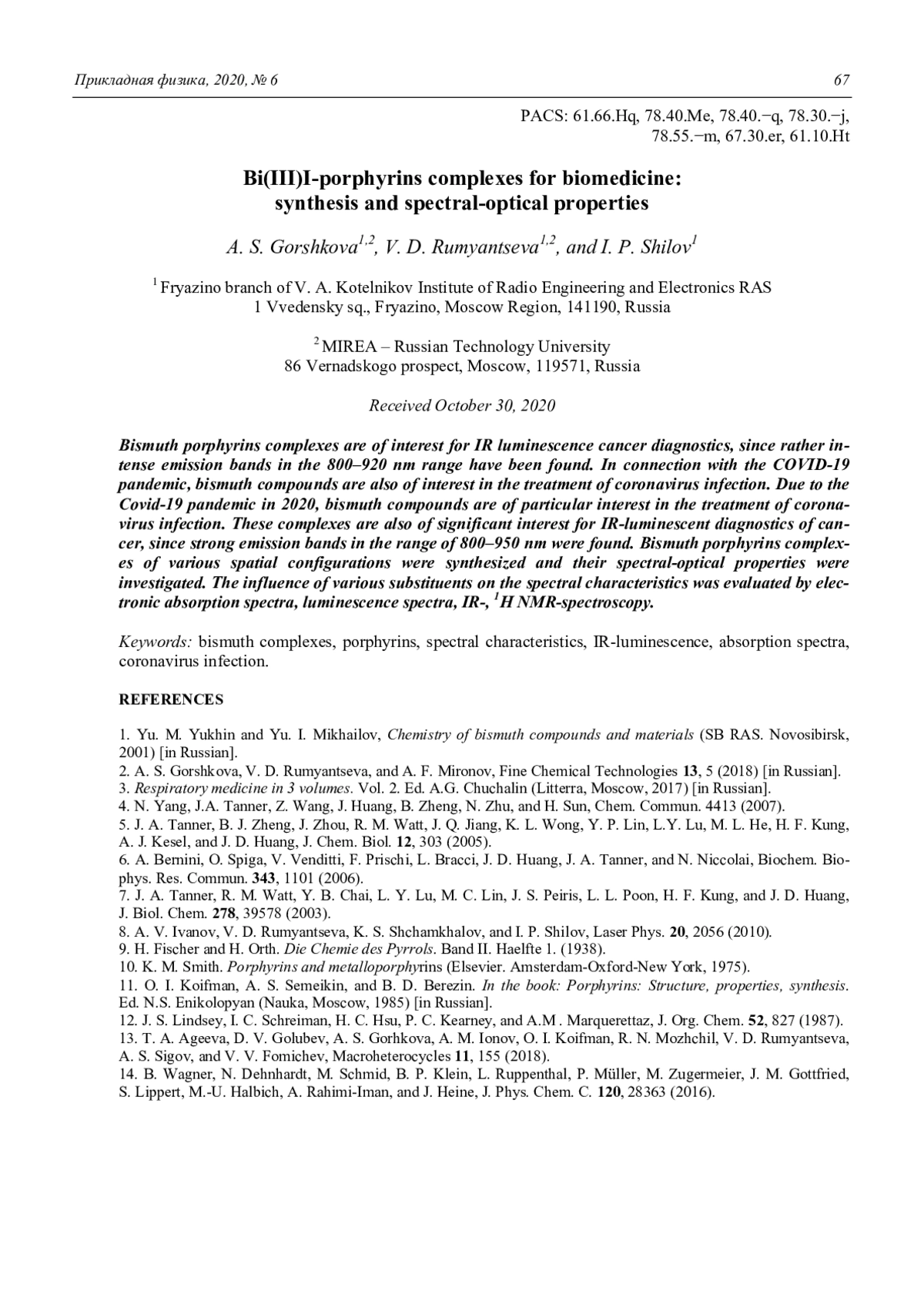 A. S. Gorshkova, V. D. Rumyantseva, and I. P. Shilov Bi(III)I-porphyrins complexes for biomedicine: synthesis and spectral-optical properties 62