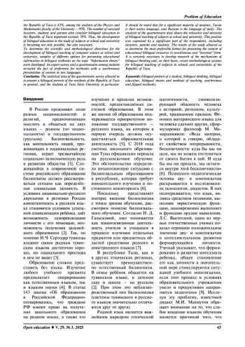 Результаты. Определение билингвального портрета жителей р. Тыва, а также выявление потребности в билингвальном обучении информатике студентов Тувинского государственного университета осуществлялось с помощью специально разработанных анкет. Анализ анкетных данных показал, что кол-во билингвалов в республике Тыва составляет 82%, среди студентов физико-математического факультета ТувГУ – 99%. Кол-во опрошенных преподавателей, студентов и родителей, считающих важным билингвальное образование в республике Тыва, превышает 70%. Таким образом, развитие билингвального обучения при изучении предметов в школе и вузе становится не только возможным, но и необходимым. Для определения научно-методических направлений развития билингвального обучения информатике в школе и вузе были разработаны образцы разных вариантов представления учебной информации в билингвальных учебниках по теме «Теория информации». Экспертный опрос и анкетирование студентов выявили факт предпочтения учебникам с синхронным представлением содержания на двух языках.