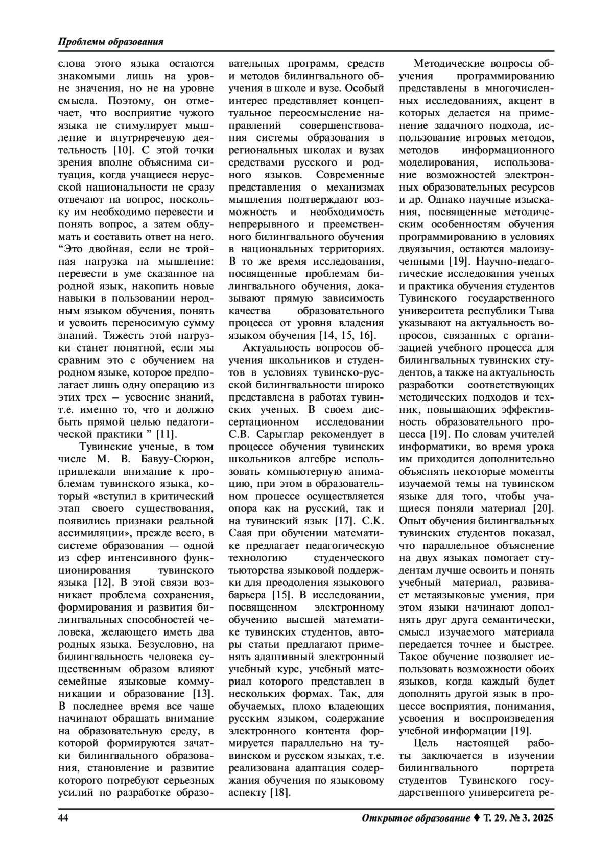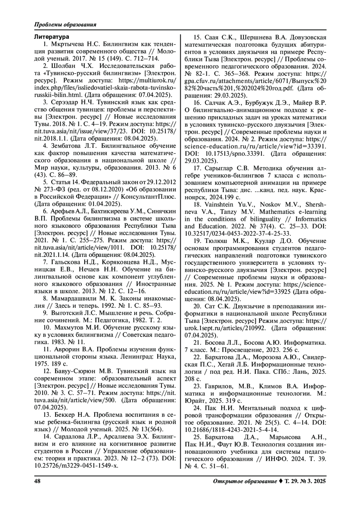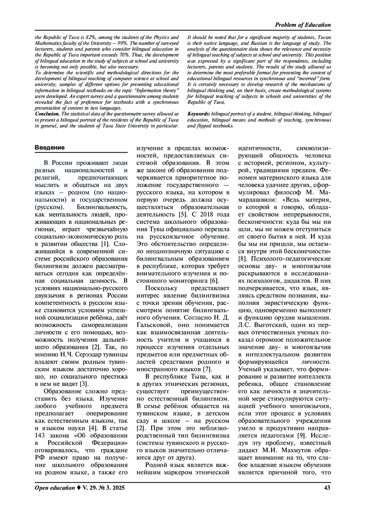 Заключение. Статистические данные анкетного опроса позволили представить билингвальный портрет жителей республики Тыва в целом, и студенческого контингента Тувинского государственного университета в частности. Следует отметить, что для значительного большинства обучаемых тувинский язык является родным, а русский язык – языком обучения. Анализ анкетных данных показывает актуальность и необходимость билингвального обучения предметам в школе и вузе. Эту позицию выразила значительная часть респондентов, включающих преподавателей, родителей и студентов. Результаты исследования позволили определить наиболее предпочтительный формат представления содержания учебных билингвальных ресурсов в синхронном и «перевернутом» виде. Безусловно следует развивать исследования механизмов билингвального мышления и на их основе создавать методические системы билингального обучения предметам в школах и вузах р. Тыва.