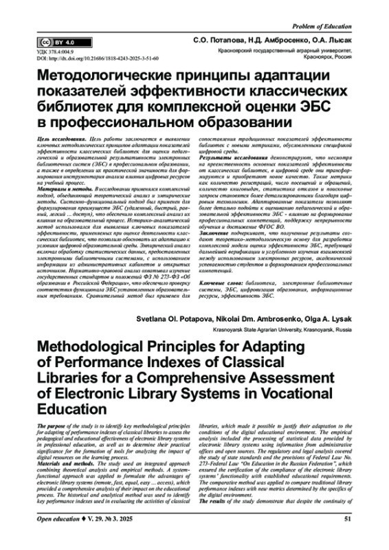 Цель исследования. Цель работы заключается в выявлении ключевых методологических принципов адаптации показателей эффективности классических библиотек для оценки педагогической и образовательной результативности электронных библиотечных систем (ЭБС) в профессиональном образовании, а также в определении их практической значимости для формирования инструментария анализа влияния цифровых ресурсов на учебный процесс.
