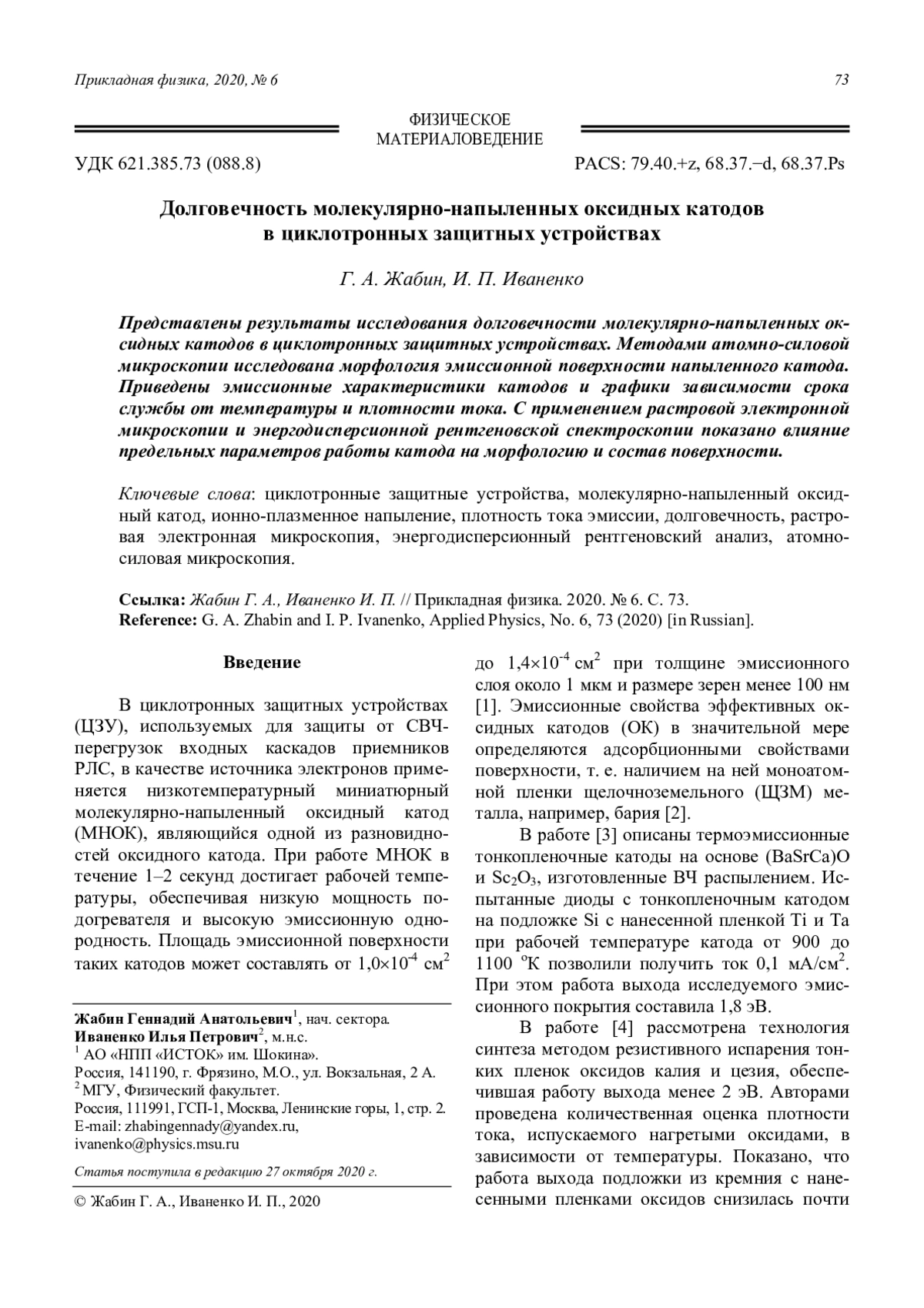 Жабин Г. А., Иваненко И. П. Долговечность молекулярно-напыленных оксидных катодов в циклотронных защитных устройствах 73