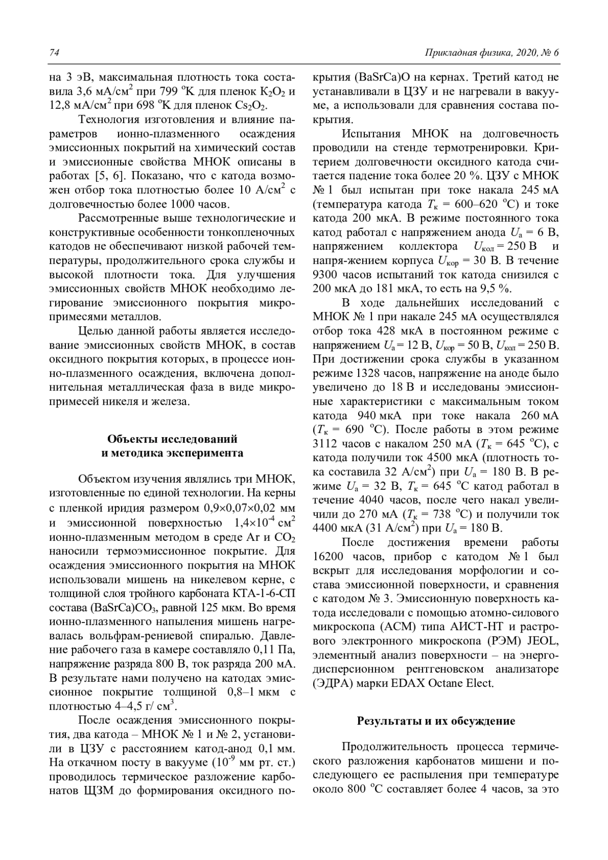 2. Легирование эмиссионного слоя МНОК с размерами кристаллитов до 100 нм микропримесями Ni и Fe – 0,1–0,2 масс. % во время ионно-плазменного напыления позволило увеличить эмиссионный ток и долговечность. При толщине эмиссионного покрытия 0,8-1 мкм, плотности тока 1,5–2 А/см2 и рабочей температуре 600–620 оC, долговечность современного МНОК в ЦЗУ достигает 12– 16 тыс. часов.