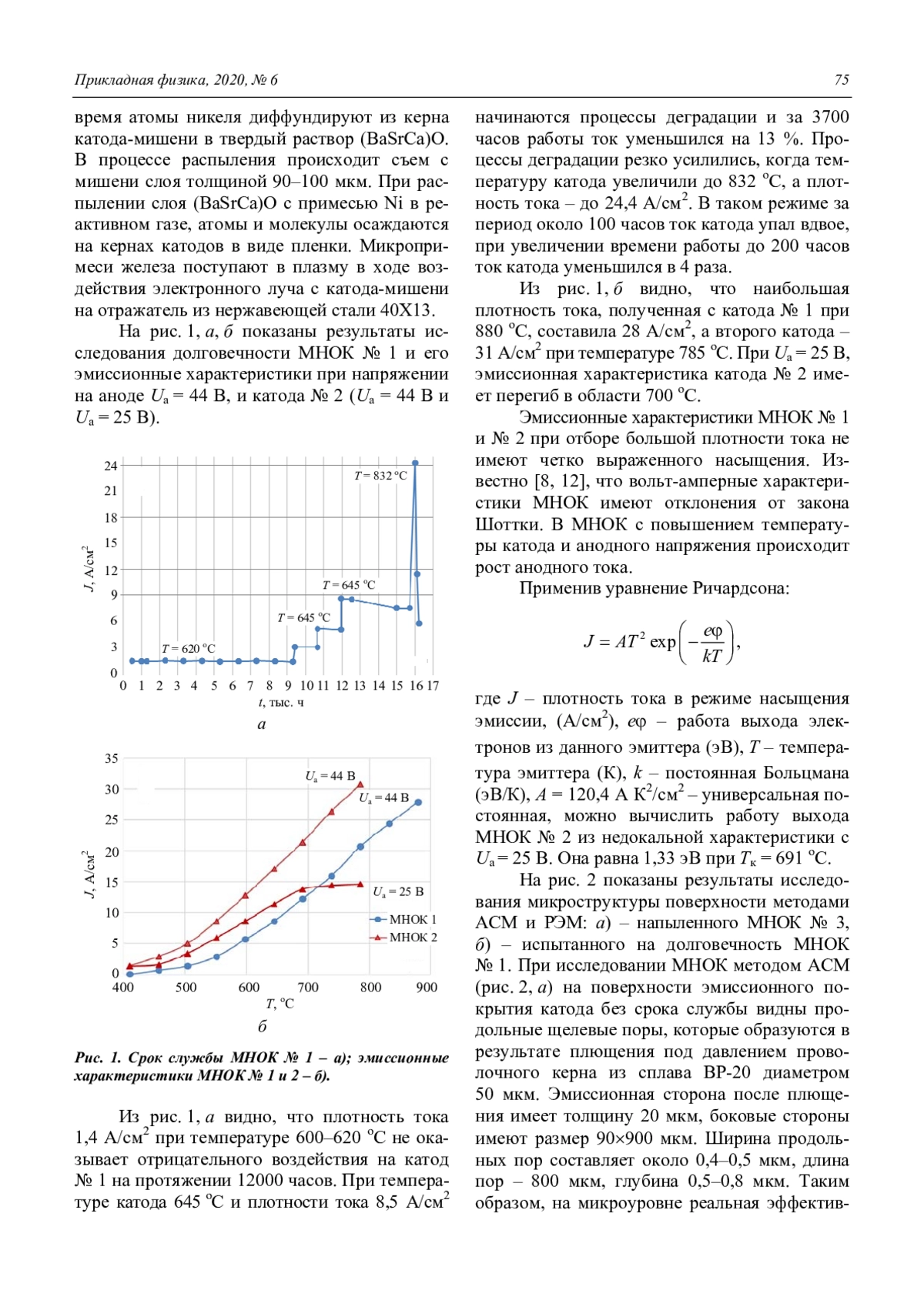 4. Отбор тока c МНОК более 24 А/см2 при температуре 830–850 оC резко сократил время его работы до 200 часов из-за интенсивного испарения Ва и деградации эмиссионного покрытия.