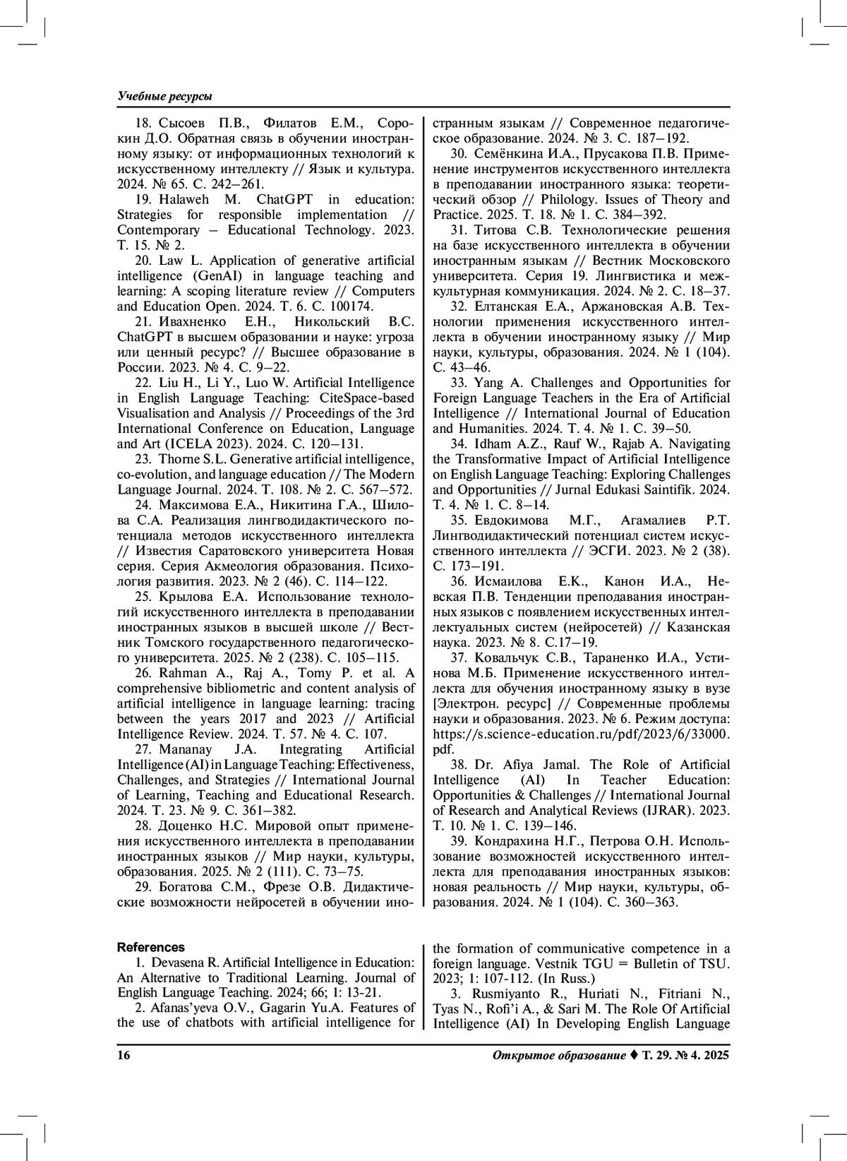 25. Крылова Е.А. Использование технологий искусственного интеллекта в преподавании иностранных языков в высшей школе // Вестник Томского государственного педагогического университета. 2025. № 2 (238). С. 105-115.