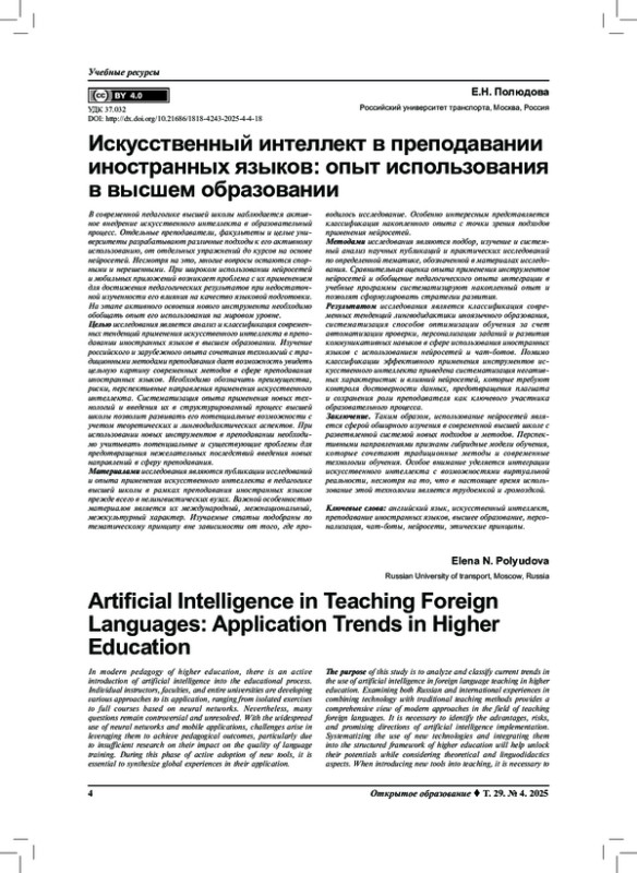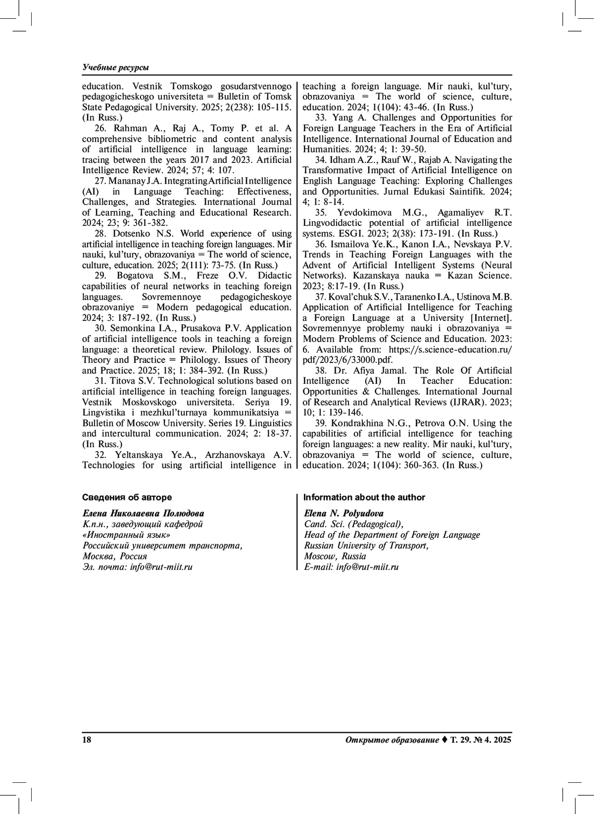 30. Семёнкина И.А., Прусакова П.В. Применение инструментов искусственного интеллекта в преподавании иностранного языка: теоретический обзор // Philology. Issues of Theory and Practice. 2025. Т. 18. № 1. С. 384-392.