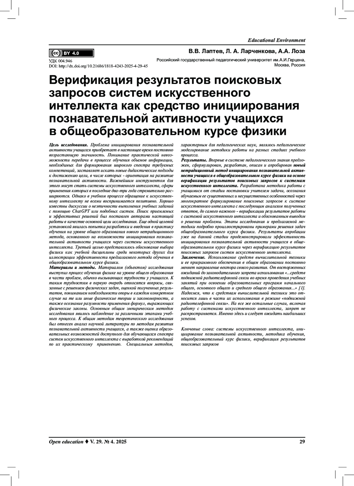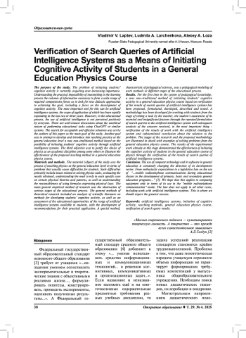 Результаты. Впервые в системе педагогического знания предложен, сформулирован, разработан, описан и апробирован новый нетрадиционный метод инициирования познавательной активности учащихся в общеобразовательном курсе физики на основе верификации результатов поисковых запросов к системам искусственного интеллекта. Разработана методика работы с учащимися от стадии постановки учителем задачи, осознания обучаемым ее существенных и несущественных особенностей через многократное формулирование поисковых запросов к системе искусственного интеллекта с последующим анализом полученных ответов, до самого важного - верификации результатов работы с системой искусственного интеллекта и обоснованным выводом о решении проблемы. Этапы исследования и предлагаемой методики подробно проиллюстрированы примерами решения задач общеобразовательного курса физики. Результаты апробации уже на данной стадии продемонстрировали эффективность инициирования познавательной активности учащихся в общеобразовательном курсе физики через верификацию результатов поисковых запросов систем искусственного интеллекта.