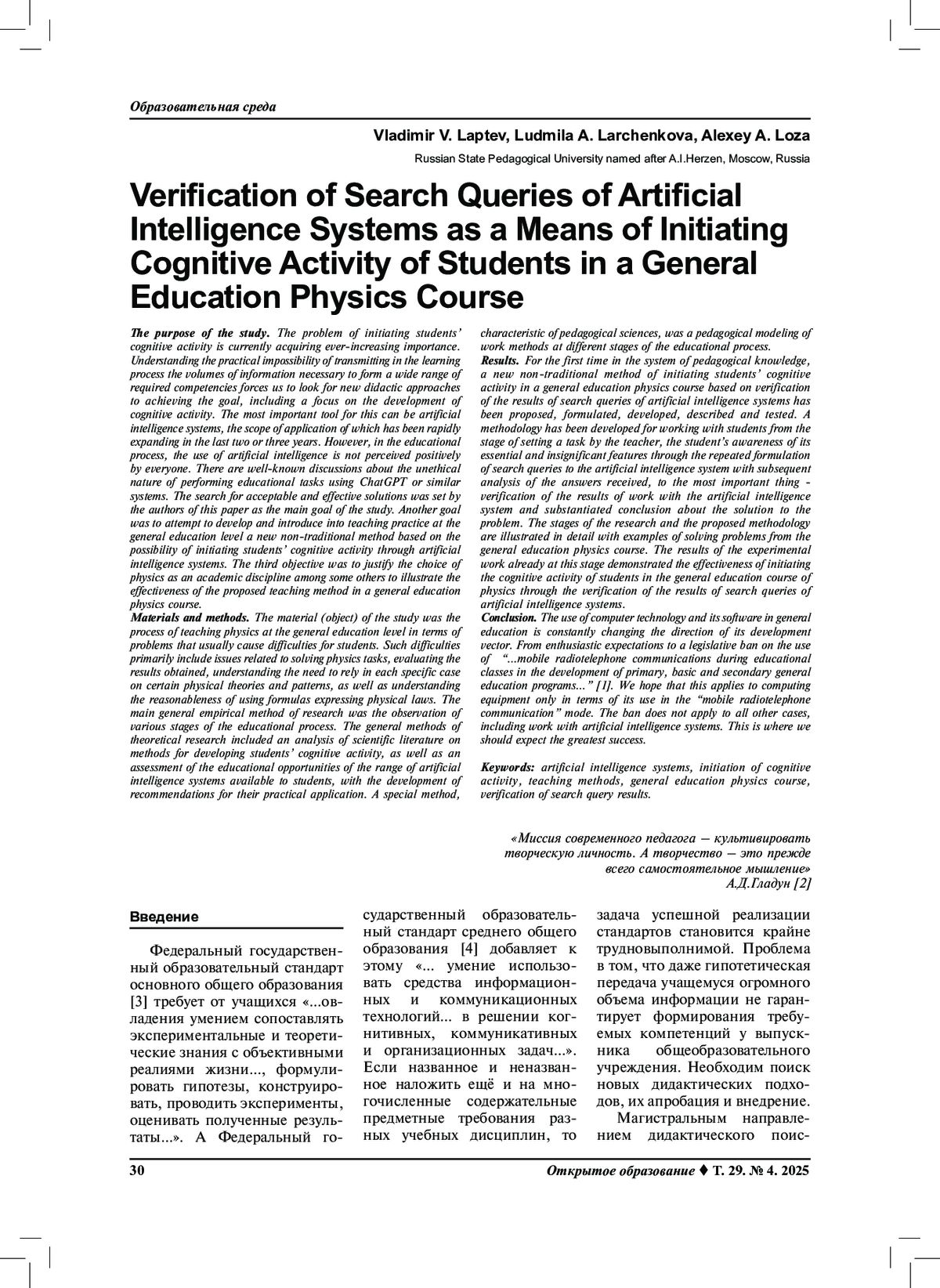 Цель исследования. Проблема инициирования познавательной активности учащихся приобретает в настоящее время постоянно возрастающую значимость. Понимание практической невозможности передачи в процессе обучения объемов информации, необходимых для формирования широкого спектра требуемых компетенций, заставляет искать новые дидактические подходы к достижению цели, в числе которых - ориентация на развитие познавательной активности. Важнейшим инструментом для этого могут стать системы искусственного интеллекта, сферы применения которых в последние два-три года стремительно расширяются. Однако в учебном процессе обращение к искусственному интеллекту не всеми воспринимается позитивно. Хорошо известны дискуссии о неэтичности выполнения учебных заданий с помощью ChatGPT или подобных систем. Поиск приемлемых и эффективных решений был поставлен авторами настоящей работы в качестве основной цели исследования. Еще одной целевой установкой явилась попытка разработки и введения в практику обучения на уровне общего образования нового нетрадиционного метода, основанного на возможности инициирования познавательной активности учащихся через системы искусственного интеллекта. Третьей целью представлялось обоснование выбора физики как учебной дисциплины среди некоторых других для иллюстрации эффективности предлагаемого метода обучения в общеобразовательном курсе физики.