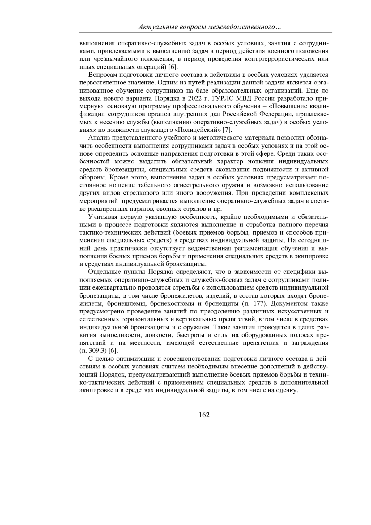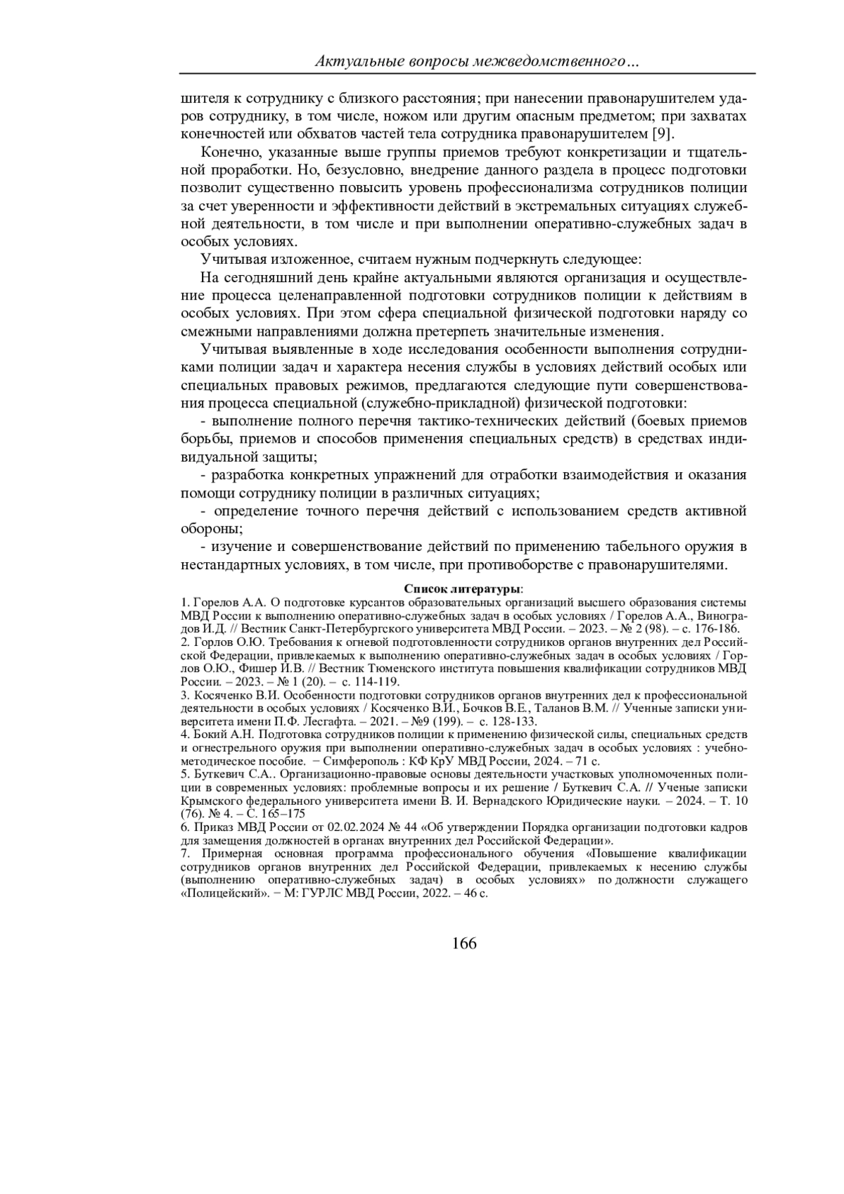 1. Горелов А.А. О подготовке курсантов образовательных организаций высшего образования системы МВД России к выполнению оперативно-служебных задач в особых условиях / Горелов А.А., Виноградов И.Д. // Вестник Санкт-Петербургского университета МВД России. - 2023. - № 2 (98). - с. 176-186. EDN: XRALWI