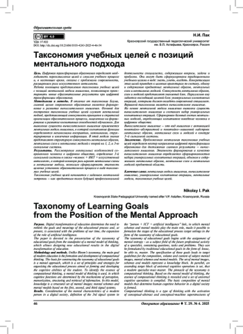 Цель. Цифровая трансформация образования определяет необходимость переосмысления целей и смыслов учебного процессе и, в настоящее время, связана с проблемами современности, расширением роли искусственного интеллекта. Работа посвящена представлению таксономии учебных целей с позиций ментальной модели мышления, позволяющую проектировать новые образовательные результаты при цифровой трансформации образования.