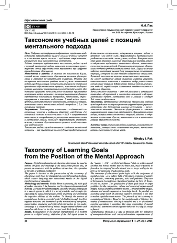Результаты. Рассмотрение ментальных особенностей современного человека в цифровом обществе, определение 3-й сигнальной системы в связке «человек + ИКТ + искусственный интеллект», в которой основную роль играют ментальные схемы и ментальные модели, позволило сформулировать этапность целевых установок образовательного процесса в виде таксономии учебных целей. Таксономия учебных целей начинается с заданием ментальной энтропии – как предметным полем будущей профессиональной деятельности специалиста, содержащим вопросы, задачи и проблемы. Они могут быть сформулированы традиционными учебными целями в виде: знать, уметь, владеть. Конкретизация этих целей приводит к целевым ориентирам по составу, объему и содержанию предметных ментальных образов, ментальных схем и ментальных моделей. Совокупность ментальных образов, схем и моделей представляют знаниевый блок. Параллельно ему задается восходящий целевой блок универсальных когнитивных операций, которыми должен овладеть современный специалист. Вершиной таксономии является вычислительное мышление. На основе ментальной модели мышления выявлена сущность вычислительного мышления и составлен набор универсальных когнитивных операций. Сформирован базовый состав ментальных моделей, определяющих когнитивное поведение человека в цифровом обществе.