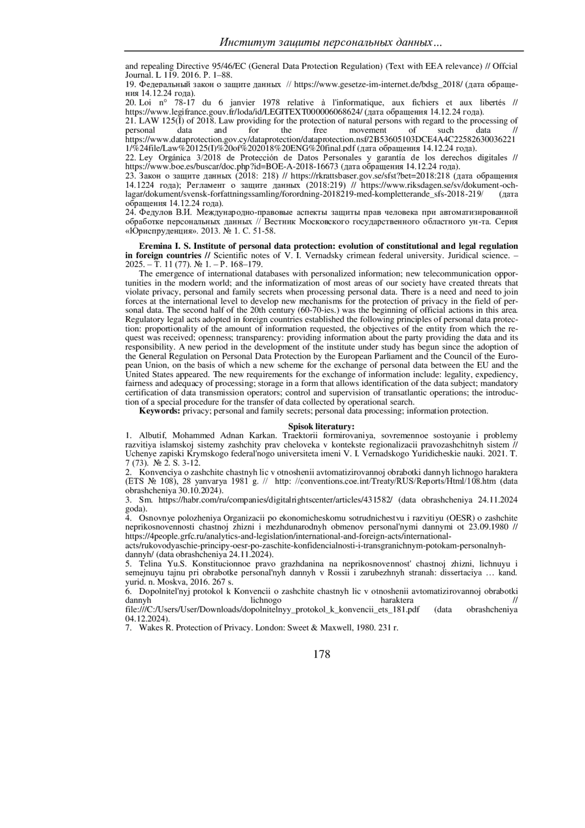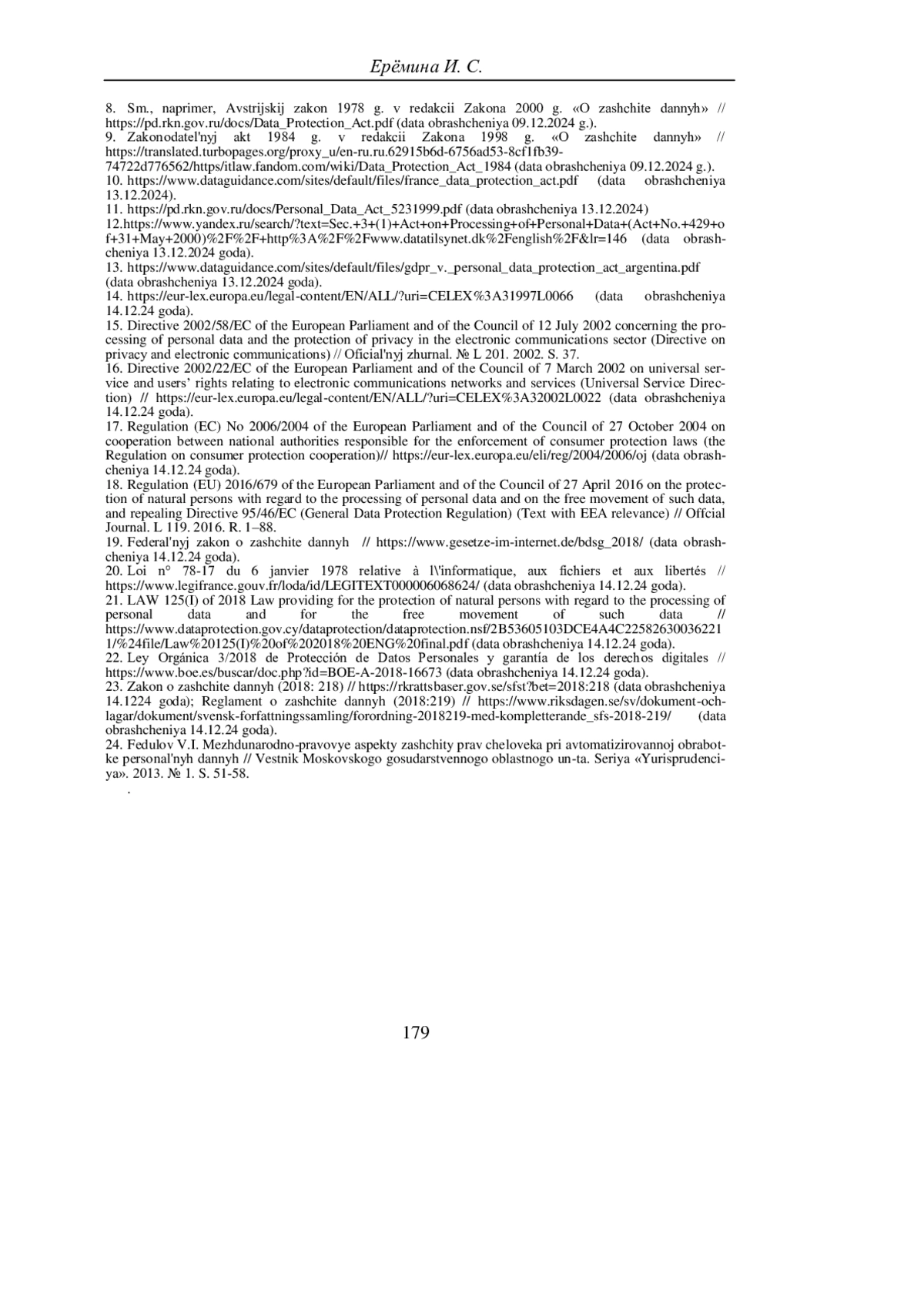 24. Федулов В.И. Международно-правовые аспекты защиты прав человека при автоматизированной обработке персональных данных // Вестник Московского государственного областного ун-та. Серия “Юриспруденция”. 2013. № 1. С. 51-58.