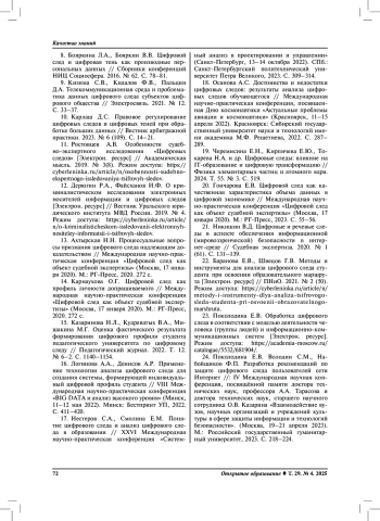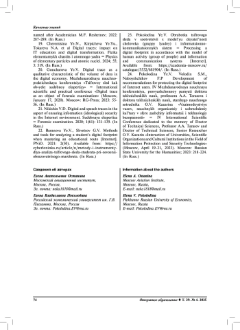 19. Черемисина Е.Н., Кирпичева Е.Ю., Токарева Н.А. и др. Цифровые следы: влияние на IT-образование и цифровую трансформацию // Физика элементарных частиц и атомного ядра. 2024. Т. 55. № 3. С. 519.