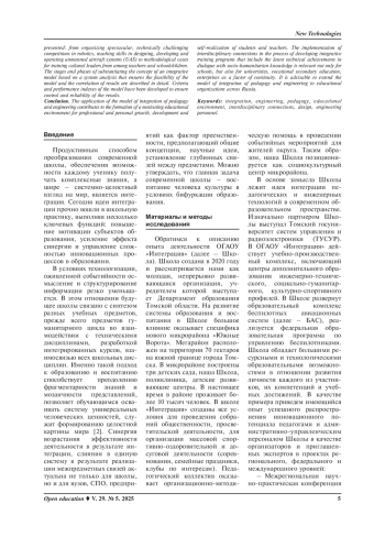 Материалы и методы исследования. Для достижения поставленной цели используется комплексный подход к анализу интеграционных процессов в образовании. Данный подход обеспечивается системой исследовательских методов: описательно-аналитический (анализ источников по теме исследования; обобщение психолого-педагогической литературы; интерпретация данных), метод контекстуального анализа (выявление значения и функции понятия в ситуативной среде, в окружении и взаимосвязи с другими элементами) и эмпирический метод (наблюдение, изучение продуктов деятельности, анализ документации). Модель интеграции педагогики и инженерии посредством модификации содержания, форм, технологий образовательной деятельности способствует преодолению фрагментарности знаний, установлению глубинных связей между предметами, позволяет субъектам образовательного процесса аккумулировать технологические и гуманитарные знания, выстраивать ценностные ориентиры и культурное поле личности.