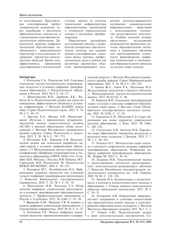 Заключение. Созданная модель обеспечивает научно-методологическую базу для проектирования персонализированных образовательных траекторий в системе непрерывного профессионального развития педагогических кадров. Типологизация компетенций по принципу межуровневого распределения создает условия для гибкого формирования индивидуальных программ освоения цифровых технологий с учетом профессиональных потребностей и начального уровня подготовки. Операционализация компетенций через измеримые действия позволяет осуществлять объективную диагностику профессиональных дефицитов и планировать целенаправленную коррекционную работу в условиях использования отечественного программного обеспечения и цифровых платформ.