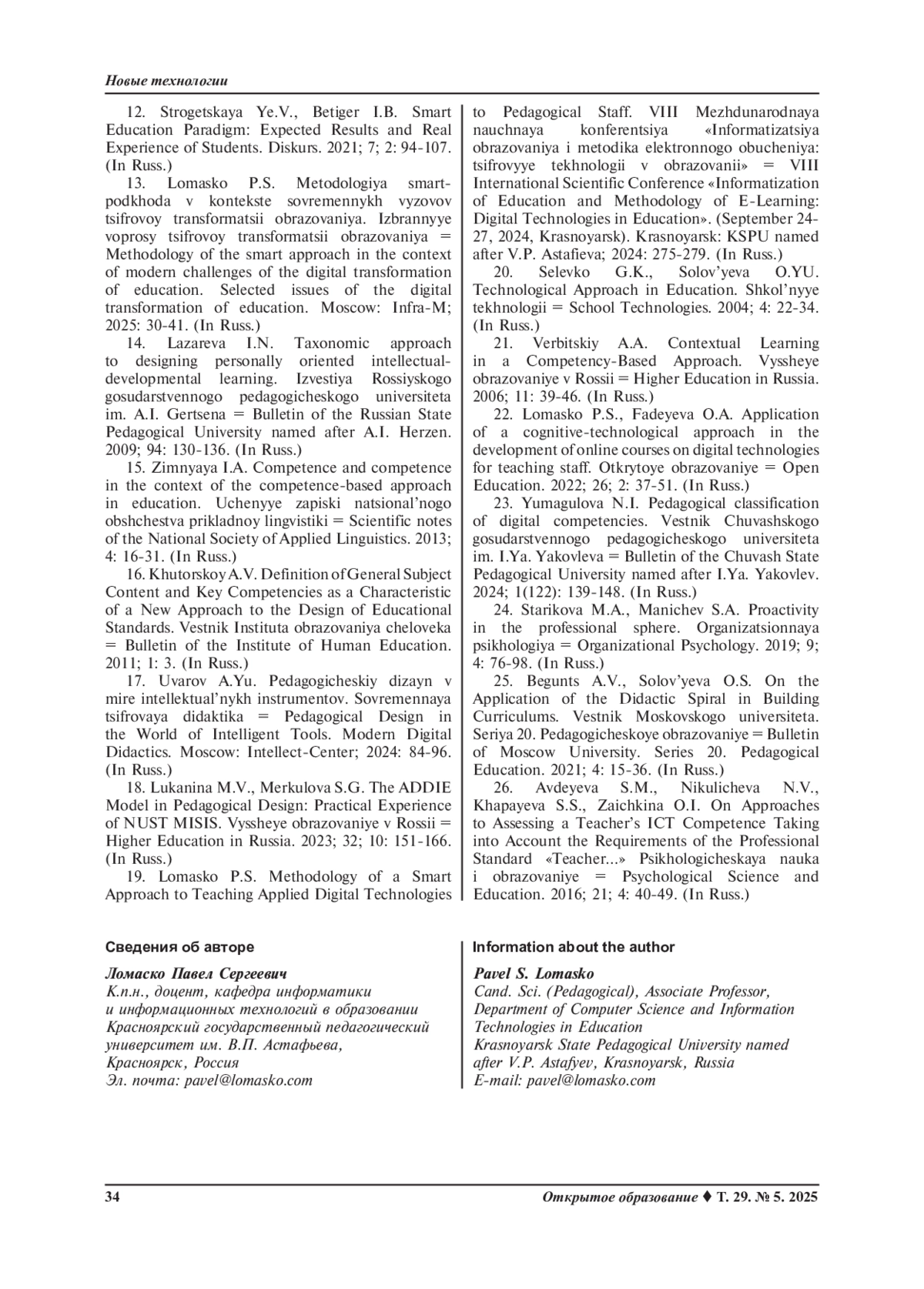 Цель исследования. Исследование направлено на разработку и обоснование четырехуровневой модели классификации цифровых компетенций работников сферы образования для педагогического дизайна онлайн-курсов на основе смарт-подхода, обеспечивающего гибкость, адаптивность, вариативность и технологичность профессиональной подготовки в условиях реализации государственной политики цифрового суверенитета и технологической независимости Российской Федерации. Актуальность исследования определяется необходимостью формирования у педагогических кадров компетенций работы с отечественными цифровыми платформами и программными решениями в контексте стратегии импортозамещения образовательных технологий.