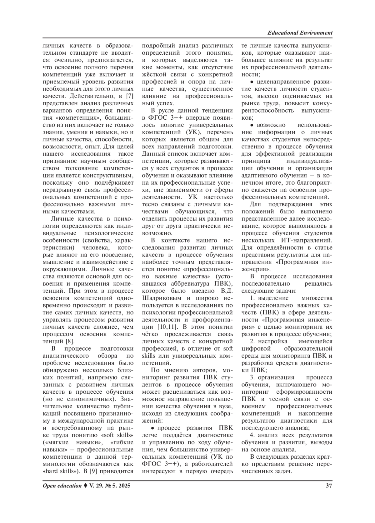 Цель исследования. Профессионально важные личные качества ИТ-специалиста ценятся на рынке труда наравне с профессиональными компетенциями, поэтому в процессе обучения в вузе важно держать в фокусе внимания их развитие. Цель выполненного исследования – обосновать, реализовать в цифровой образовательной среде и апробировать в учебном процессе технологичный способ мониторинга развития профессионально важных качеств студентов ИТ-направлений в тесной связи с освоением ими профессиональных компетенций. В статье представлен подробный анализ результатов экспериментального обучения, который позволил выявить корреляционные зависимости внутри выделенного множества профессионально важных качеств и оценить влияние уровня их развития на результаты освоения профессиональных компетенций, а также отследить динамику развития личных качеств студента в процессе обучения.
