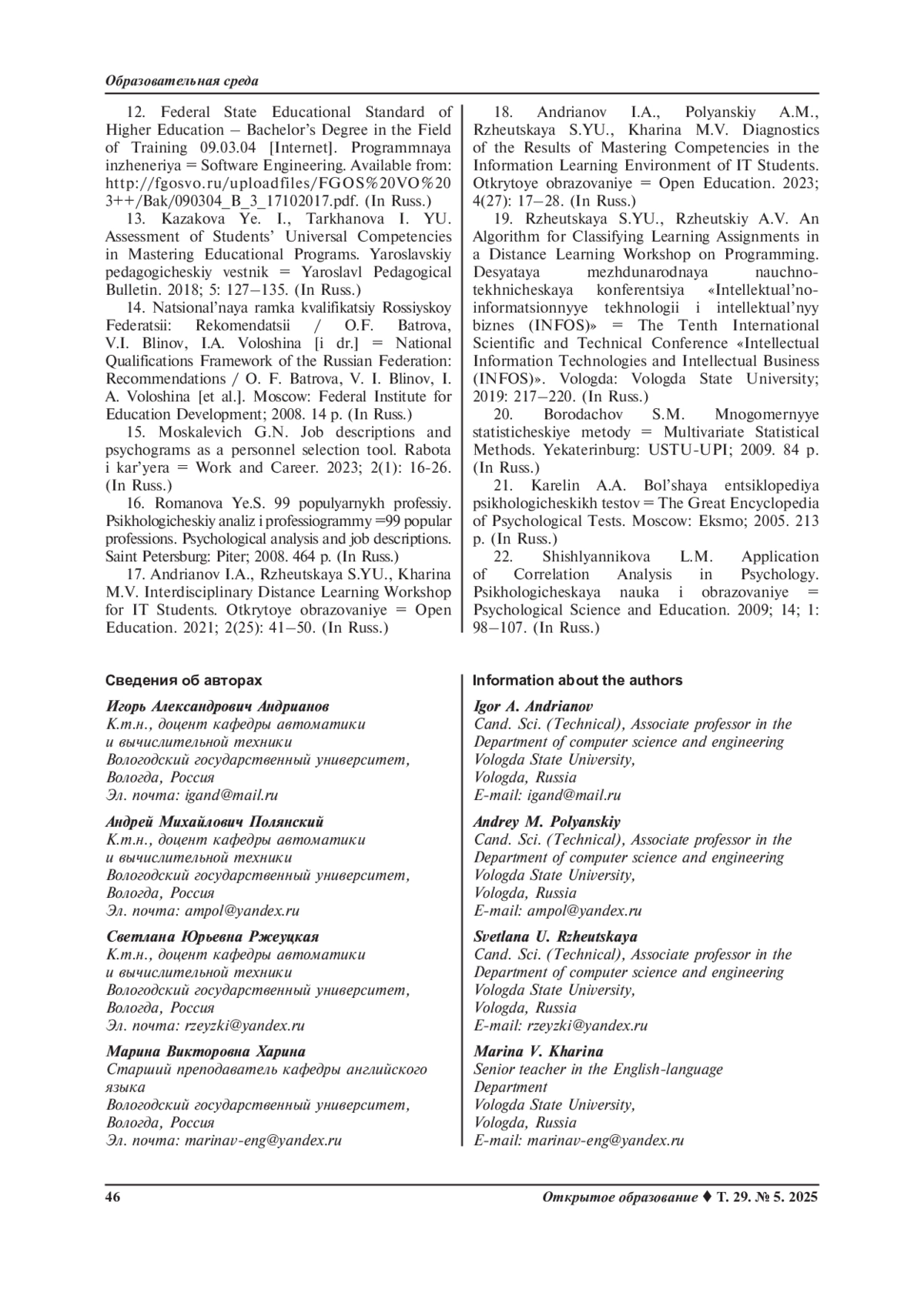 Заключение. Результаты исследования подтверждают актуальность утверждения о значимости профессионально важных качеств в компетентностной модели выпускника ИТ-направления. Предложенный базовый набор личных качеств и способ реализации мониторинга их развития могут быть распространены на различные направления подготовки ИТ-специалистов. Продолжение данного исследования имеет хорошие перспективы для организации процесса целенаправленного развития профессионально важных качеств в процессе обучения, а также для построения индивидуальных образовательных траекторий, учитывающих личные качества студента. В целом это приведёт к повышению эффективности учебного процесса и окажет положительное влияние на качество подготовки ИТ-специалистов в вузе.