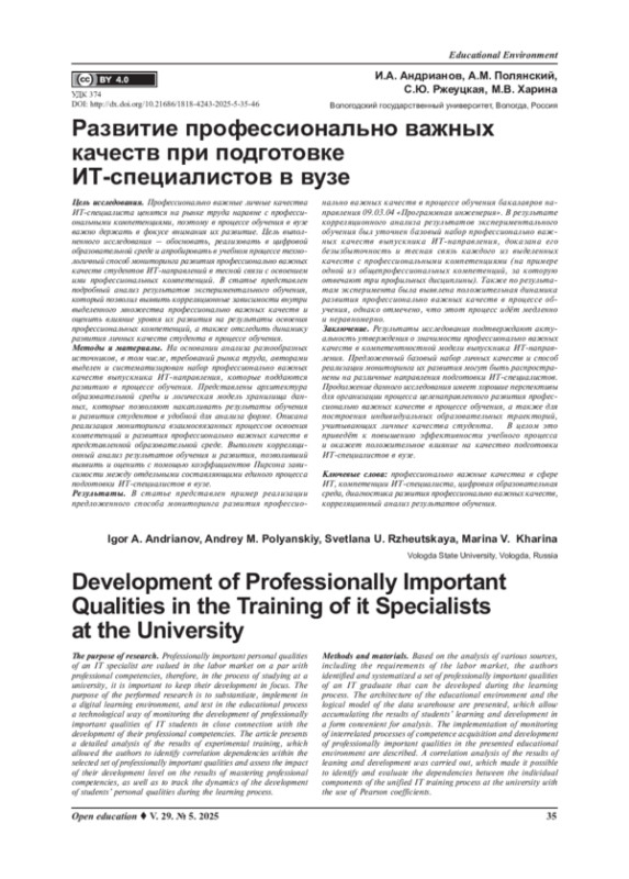 Методы и материалы. На основании анализа разнообразных источников, в том числе, требований рынка труда, авторами выделен и систематизирован набор профессионально важных качеств выпускника ИТ-направления, которые поддаются развитию в процессе обучения. Представлены архитектура образовательной среды и логическая модель хранилища данных, которые позволяют накапливать результаты обучения и развития студентов в удобной для анализа форме. Описана реализация мониторинга взаимосвязанных процессов освоения компетенций и развития профессионально важных качеств в представленной образовательной среде. Выполнен корреляционный анализ результатов обучения и развития, позволивший выявить и оценить с помощью коэффициентов Пирсона зависимости между отдельными составляющими единого процесса подготовки ИТ-специалистов в вузе.