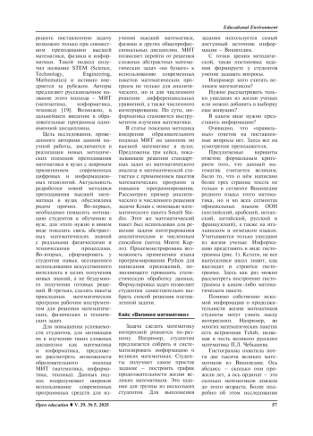 Заключение. Рассмотренный в статье образовательный подход МИТ позволяет широко использовать современные информационные и цифровые технологии для изучения высшей математики в вузах. Данный подход ведет к повышению интереса студентов к изучаемым дисциплинам, формирует навыки использования языка программирования Python и пакета прикладных математических программ Smath Studio для аналитического и численного решения сложных математических задач.