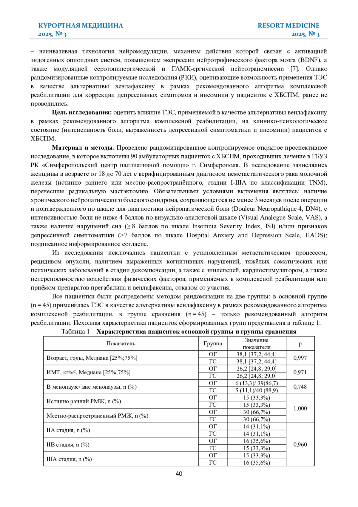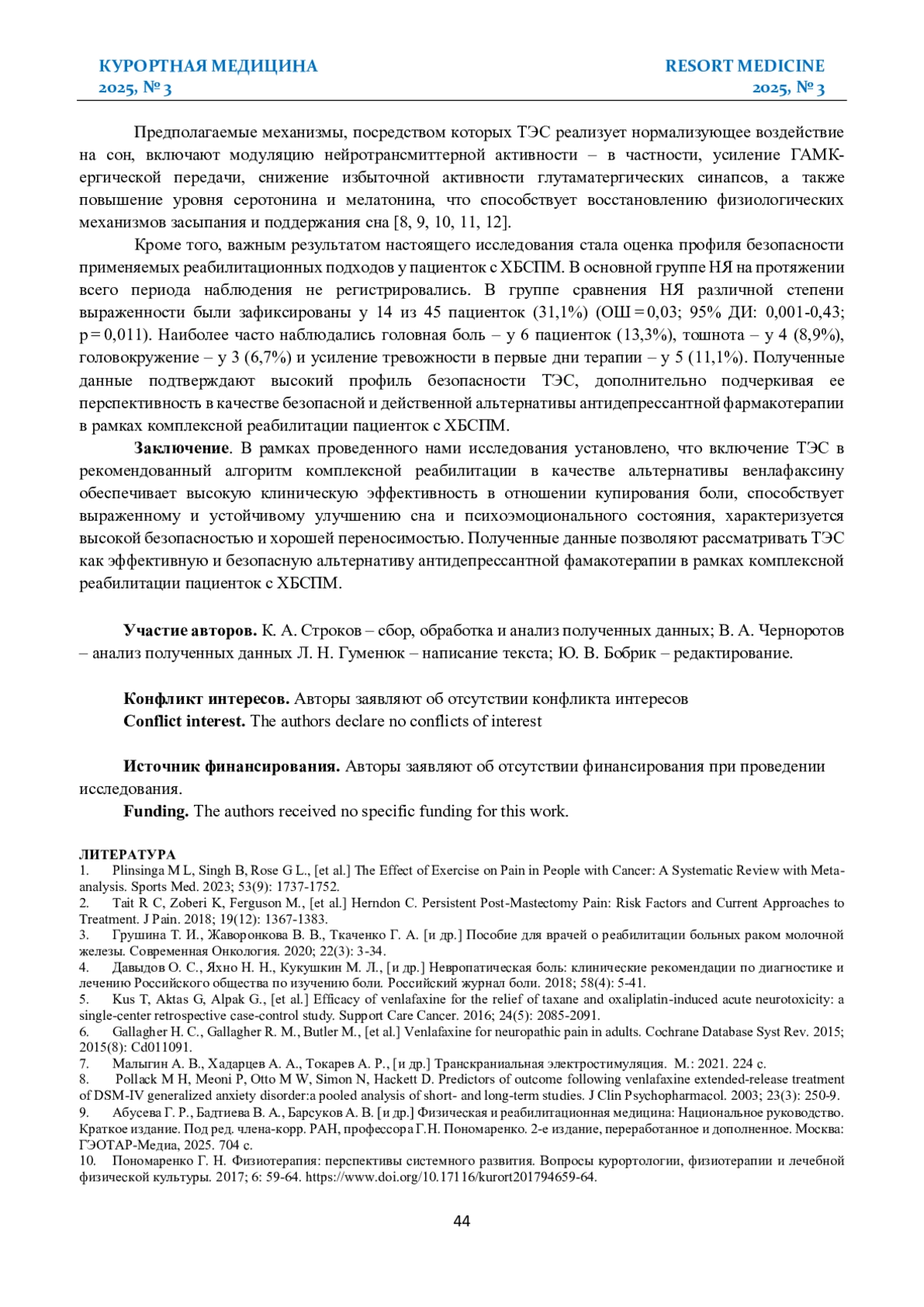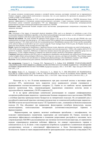 СТРОКОВ К. А., ГУМЕНЮК Л. Н., ЧЕРНОРОТОВ В. А., БОБРИК Ю. В. ВЛИЯНИЕ ТРАНСКРАНИАЛЬНОЙ ЭЛЕКТРИЧЕСКОЙ СТИМУЛЯЦИИ НА КЛИНИКО-ПСИХОЛОГИЧЕСКОЕ СОСТОЯНИЕ ПАЦИЕНТОК С ХРОНИЧЕСКИМ БОЛЕВЫМ СИНДРОМОМ ПОСЛЕ МАСТЭКТОМИИ // КУРОРТНАЯ МЕДИЦИНА. 2025. № 3