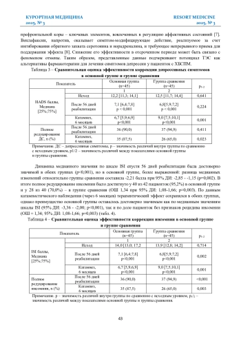 Результаты. На фоне реабилитации в обеих группах отмечено достоверное снижение боли, депрессии и инсомнии (p<0,001). В основной группе анальгезирующий эффект и редукция инсомнии были более выраженными (p=0,002), с полным купированием у 91,1% и 95,2% пациенток, соответственно. Различия по динамике депрессии между основной группой и группой сравнения были незначимыми (p=0,224); полное редуцирование симптомов наблюдалось у 90,0% и 94,9% пациенток, соответственно.