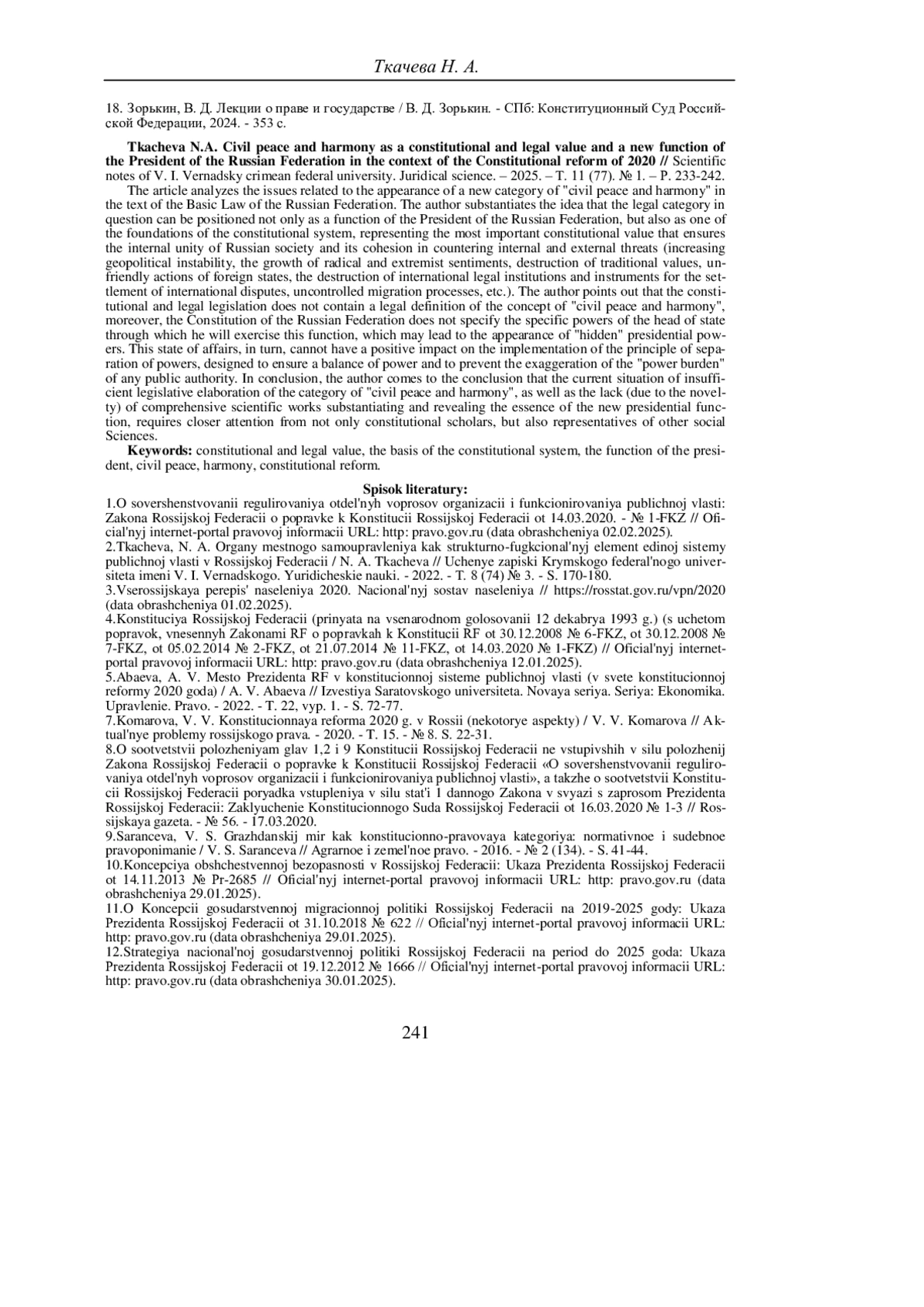 1. О совершенствовании регулирования отдельных вопросов организации и функционирования публичной власти: Закона Российской Федерации о поправке к Конституции Российской Федерации от 14.03.2020. - № 1-ФКЗ // Официальный интернет-портал правовой информации URL: http: pravo.gov.ru (дата обращения 02.02.2025).