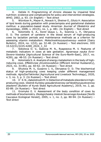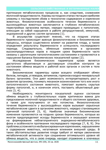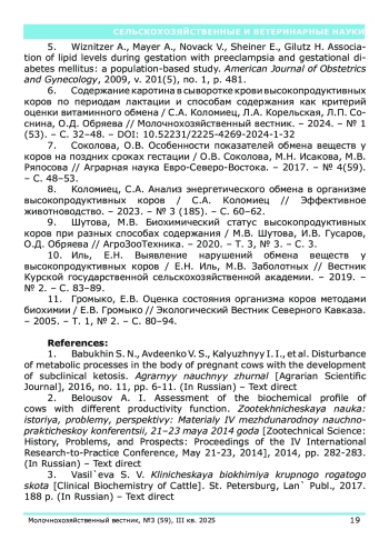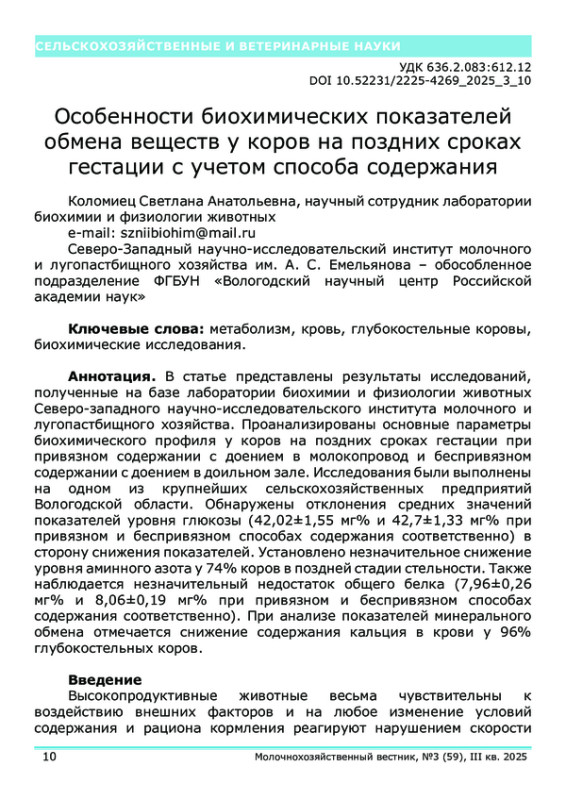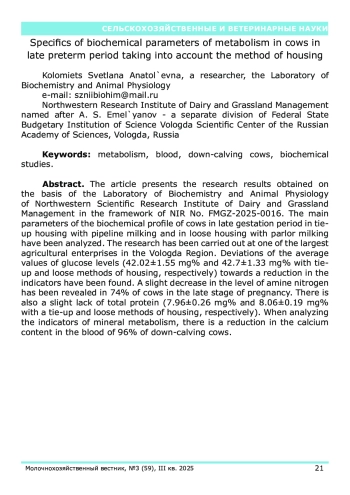 В статье представлены результаты исследований, полученные на базе лаборатории биохимии и физиологии животных Северо-западного научно-исследовательского института молочного и лугопастбищного хозяйства. Проанализированы основные параметры биохимического профиля у коров на поздних сроках гестации при привязном содержании с доением в молокопровод и беспривязном содержании с доением в доильном зале. Исследования были выполнены на одном из крупнейших сельскохозяйственных предприятий Вологодской области. Обнаружены отклонения средних значений показателей уровня глюкозы (42,02±1,55 мг% и 42,7±1,33 мг% при привязном и беспривязном способах содержания соответственно) в сторону снижения показателей. Установлено незначительное снижение уровня аминного азота у 74% коров в поздней стадии стельности. Также наблюдается незначительный недостаток общего белка (7,96±0,26 мг% и 8,06±0,19 мг% при привязном и беспривязном способах содержания соответственно). При анализе показателей минерального обмена отмечается снижение содержания кальция в крови у 96% глубокостельных коров.