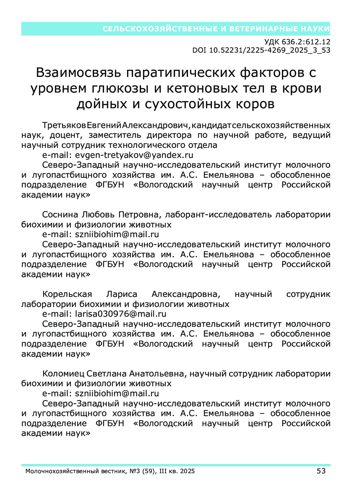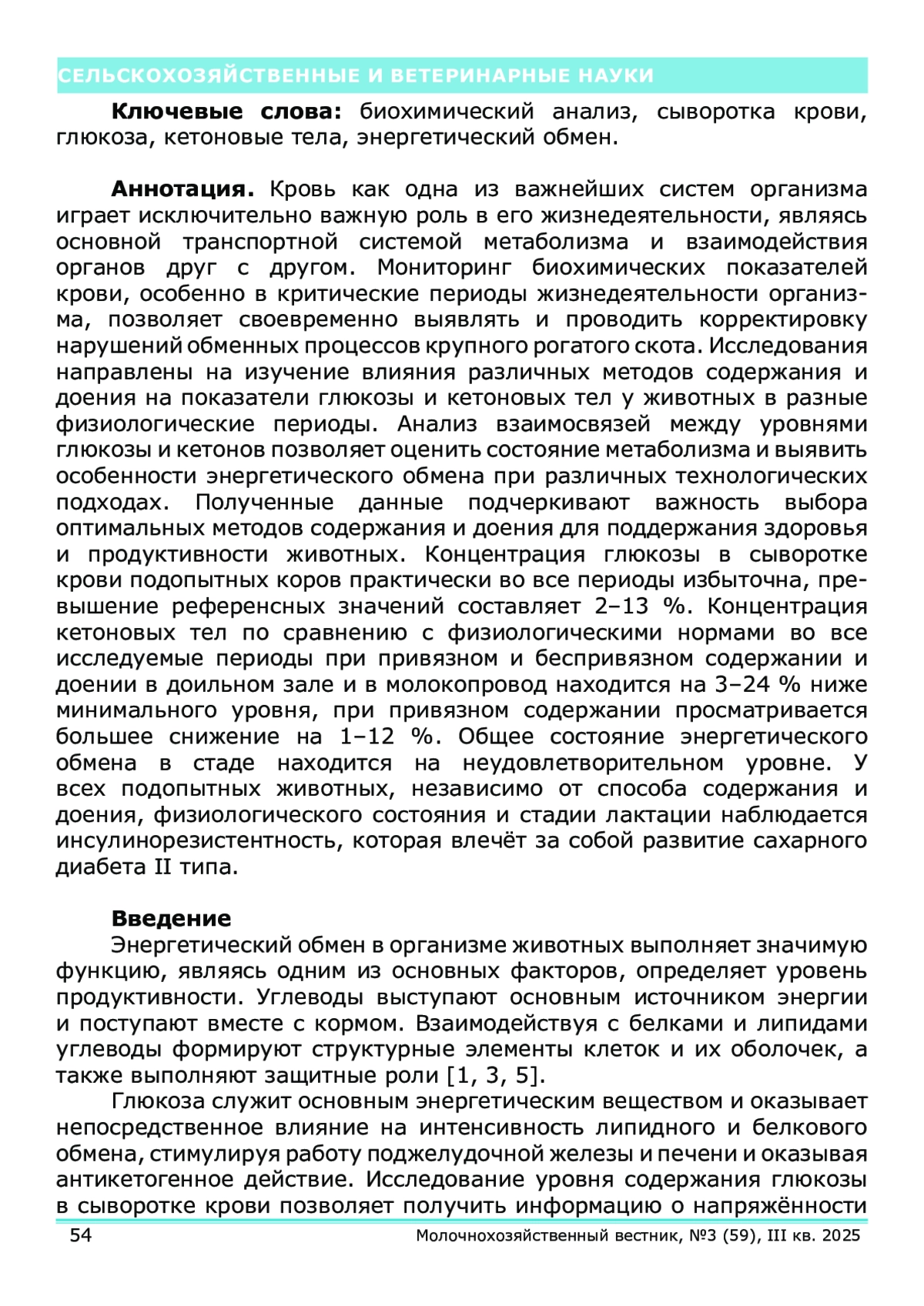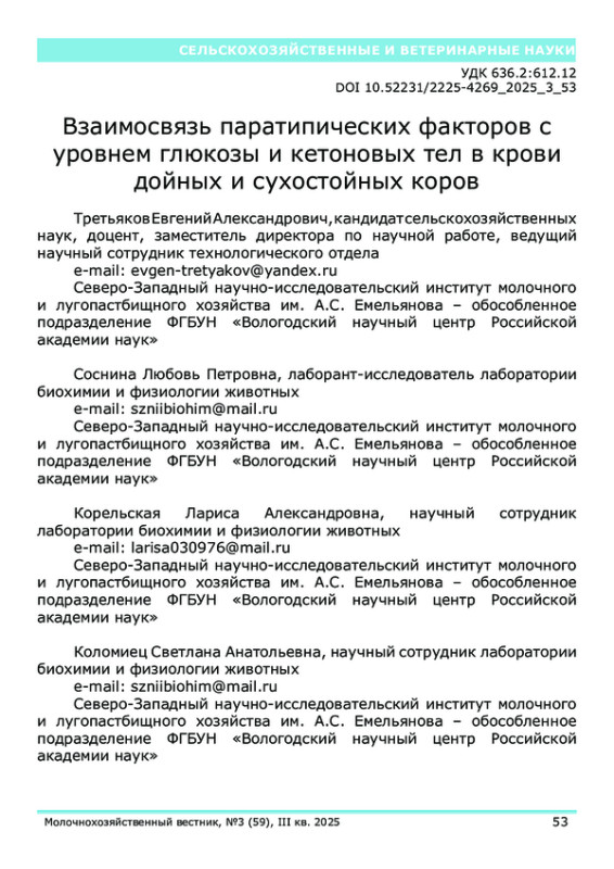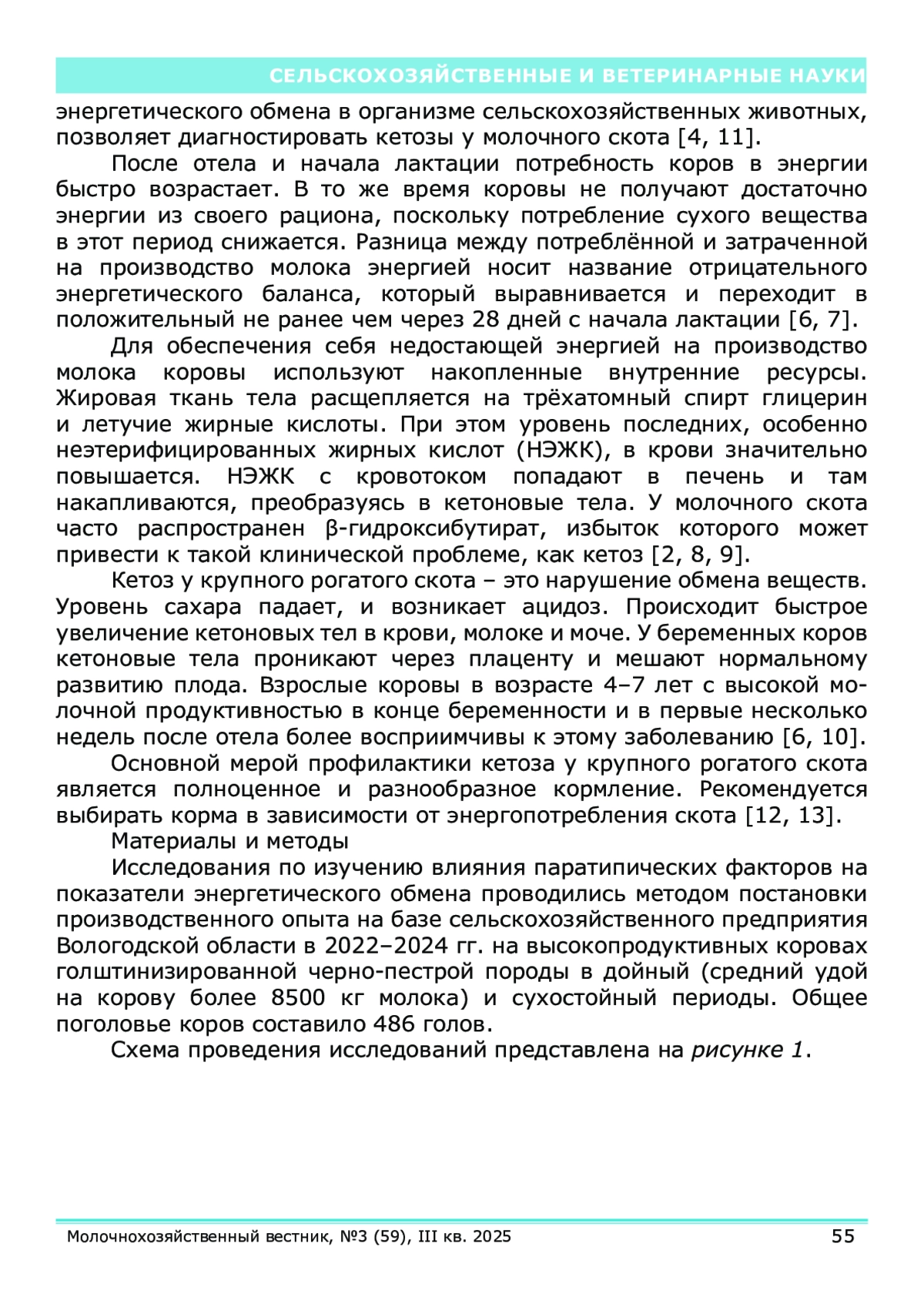 11. Корельская, Л.А. Динамика содержания кетоновых тел в крови высокопродуктивных коров в разные физиологические периоды / Л.А. Корельская, Л.П. Соснина // Эффективное животноводство. - 2023. - № 4 (186). URL: https://cyberleninka.ru/article/n/dinamikasoderzhaniya-ketonovyh-tel-v-krovi-vysokoproduktivnyh-korov-v-raznyefiziologicheskie-periody (дата обращения: 29.07.2025).