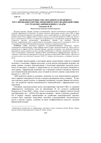 Ведущие мировые державы стремятся активизировать торгово-экономическое взаимодействие со странами Африканского континента. В данном контексте представляет интерес опыт США в сфере развития механизмов правового регулирования такого взаимодействия на двусторонней и многосторонней основе. Регион Африки южнее Сахары подпадает под действие принятого в 2000 году Закона о росте и возможностях (АГОА), в то время как сотрудничество с государствами Северной Африки регулируется другими механизмами, являющимися общими для Ближнего Востока. В целом, американский опыт в данной области заслуживает анализа для его возможного учета и использования Российской Федерацией при ведении торговли со странами континента.