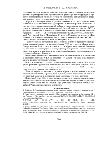 9. Kategekwa J. Recalibrating U.S. Economic Engagement with Africa in Light of the Implementation of the AfCFTA and the Final Days of the Current AGOA Authorization // The Brown Capital Management Africa Forum. Paper No. 11 - URL: https://agoa.info/images/documents/16186/kategekwa-recalibrating-useconomic-engagement-with-africa-in-light-of-the-implementation-of-the-afcfta-and-the-final-days-of-the-current-agoa-authorization.pdf (дата обращения: 03.03.2024).