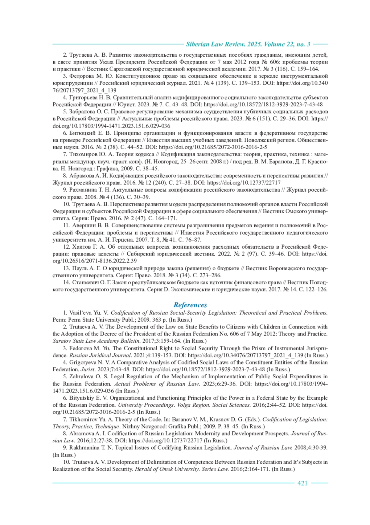 5. Забралова О. С. Правовое регулирование механизма осуществления публичных социальных расходов в Российской Федерации // Актуальные проблемы российского права. 2023. № 6 (151). С. 29-36. https://doi.org/10.17803/1994-1471.2023.151.6.029-036