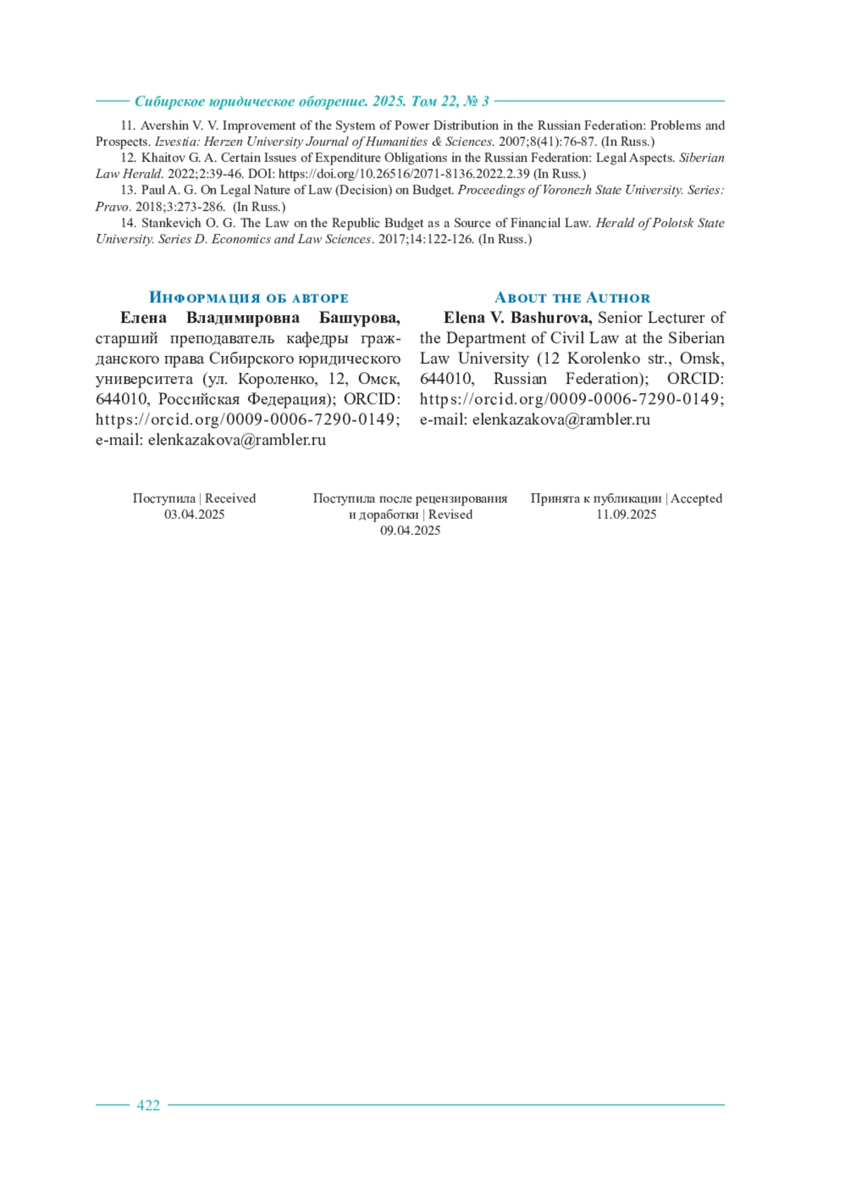 12. Хаитов Г. А. Об отдельных вопросах возникновения расходных обязательств в Российской Федерации: правовые аспекты // Сибирский юридический вестник. 2022. № 2 (97). С. 39-46. https://doi.org/10.26516/2071-8136.2022.2.39