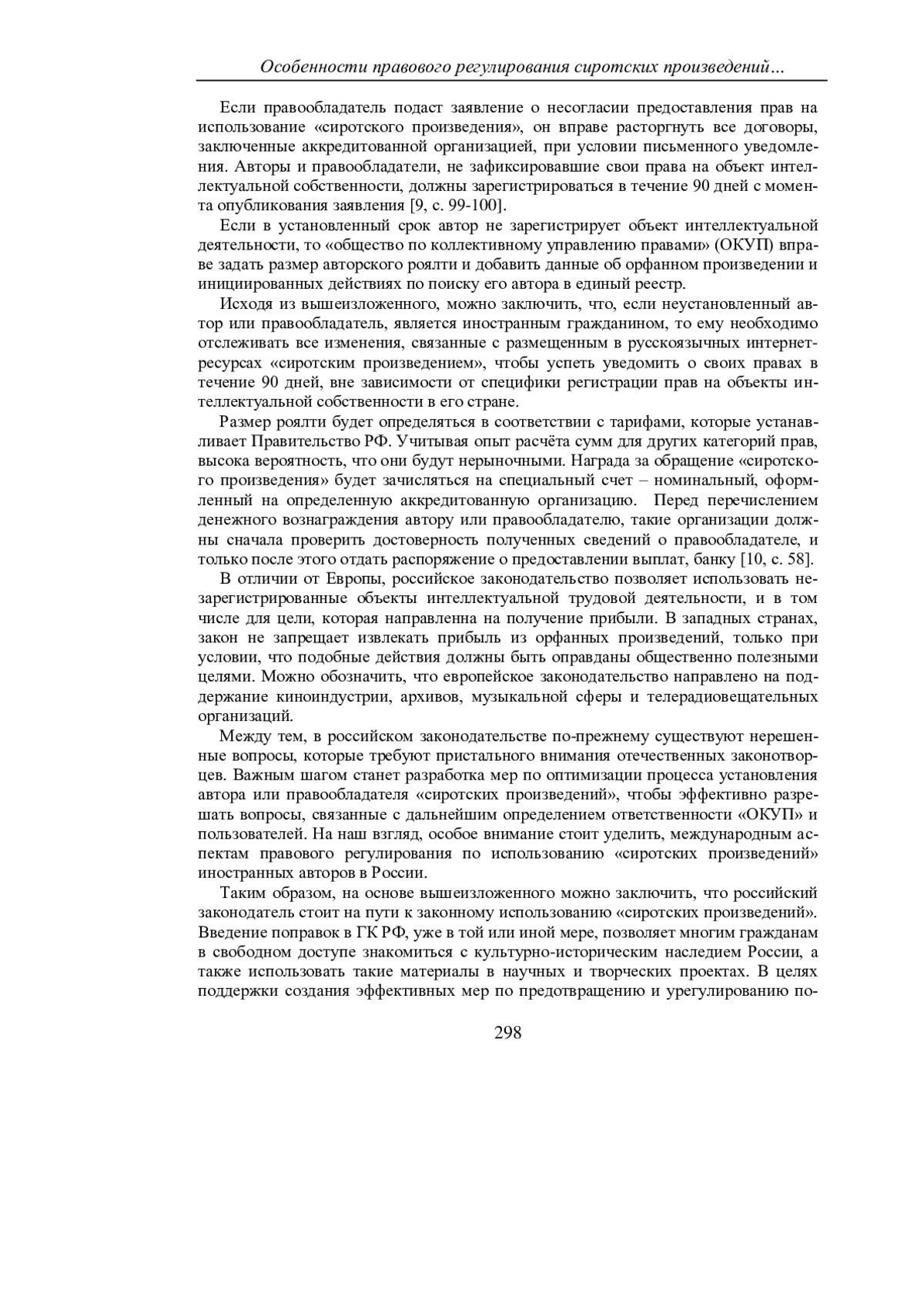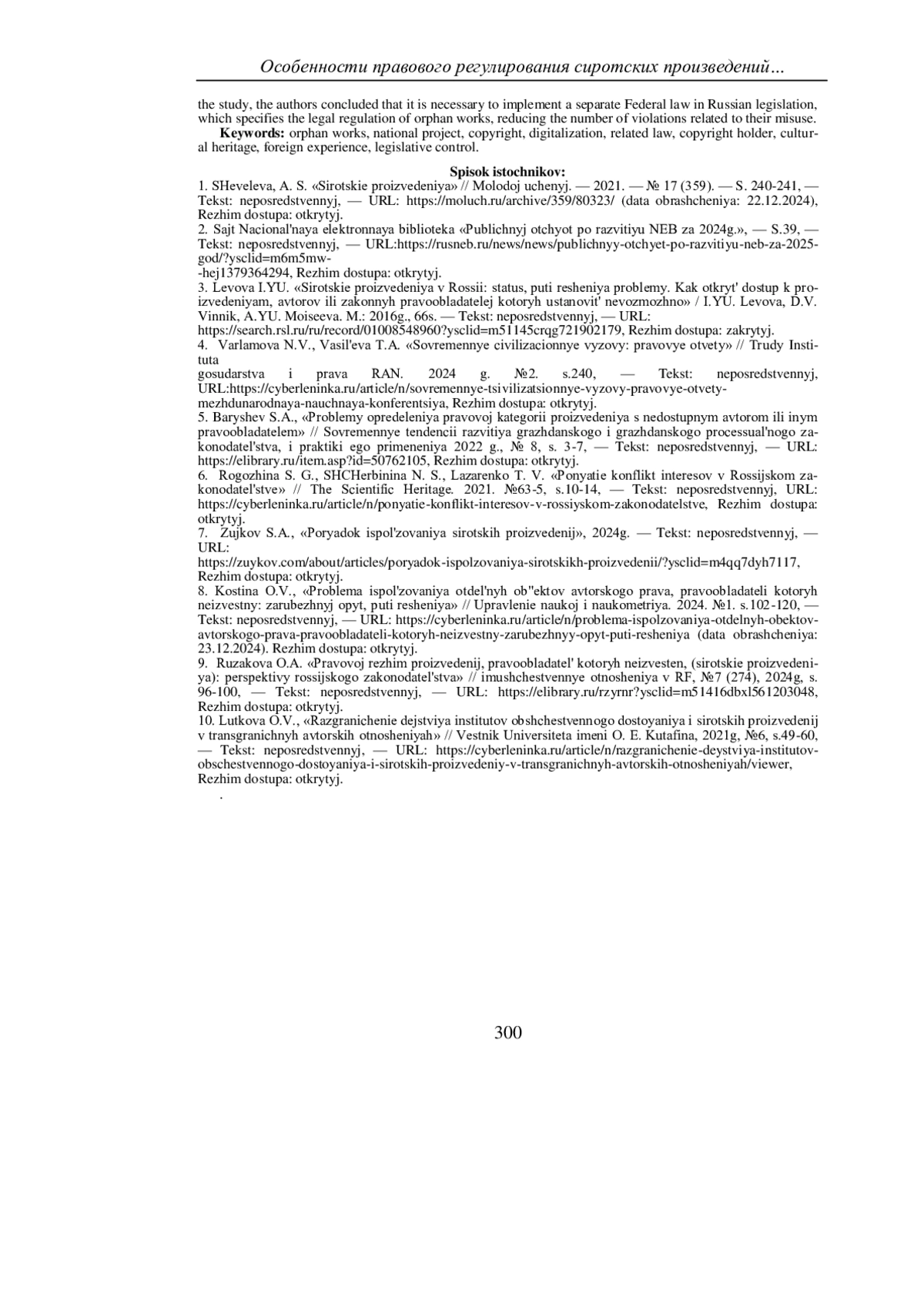 9. Рузакова О.А. “Правовой режим произведений, правообладатель которых неизвестен, (сиротские произведения): перспективы российского законодательства” // имущественные отношения в РФ, №7 (274), 2024г, с. 96-100, - Текст: непосредственный, - URL: ?ysdid=m51416dbxl561203048, Режим доступа: открытый. EDN: RZYRNR