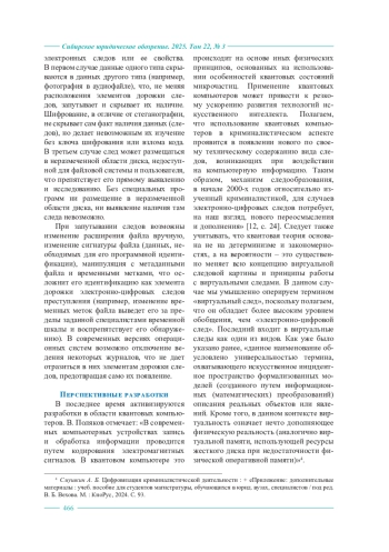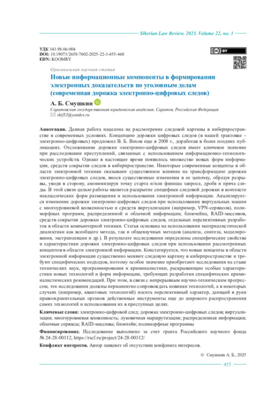 Данная работа нацелена на рассмотрение следовой картины в киберпространстве в современных условиях. Концепцию дорожки цифровых следов (в нашей трактовке – электронно-цифровых) предложил В. Б. Вехов еще в 2008 г., доработав в более поздних публикациях. Отслеживание дорожки электронно-цифровых следов имеет ключевое значение при расследовании преступлений, связанных с использованием информационно-технологических устройств. Однако в настоящее время появилось множество новых форм информации, средств сокрытия следов в киберпространстве. Некоторые современные концепты в области электронной техники оказывают существенное влияние на трансформацию дорожки электронно-цифровых следов, внося существенные изменения в ее цепочку, образуя разрывы, уводя в сторону, анонимизируя точку старта и/или финиша запроса, дробя и пряча следы. В этой связи целью работы является раскрытие специфики следовой дорожки в контексте неклассических форм размещения и использования электронной информации. Анализируется изменение дорожки электронно-цифровых следов при использовании виртуальных машин с многоуровневой вложенностью и средств виртуализации (например, VPN-сервисов), полиморфных программ, распределенной и облачной информации, блокчейна, RAID-массивов, средств сокрытия дорожки электронно-цифровых следов, отдельных перспективных разработок в области компьютерной техники. Статья основана на использовании материалистической диалектики как всеобщего метода, так и общенаучных методов (анализа, синтеза, моделирования, экстраполяции и др.). В результате исследования определены специфические свойства и характеристики дорожки электронно-цифровых следов при использовании рассмотренных концептов в области электронной информации. Констатируется, что новые концепты в области электронной информации существенно меняют следовую картину в киберпространстве и требуют специфических подходов, поэтому особое значение приобретают исследования на стыке технических наук, программирования и криминалистики, раскрывающие особые характеристики новых технологий и форм информации, требующих разработки специфических криминалистических рекомендаций. При этом, в связи с непрерывным научно-техническим прогрессом, эти исследования должны перманентно сопровождать новинки технологий, а в некоторых случаях (например, квантовых технологий) носить перспективный характер, дающий в руки правоохранительных органов действенные инструменты еще до широкого распространения самих технологий и использования их в преступных целях.