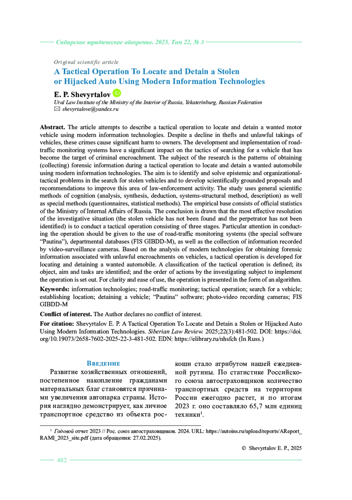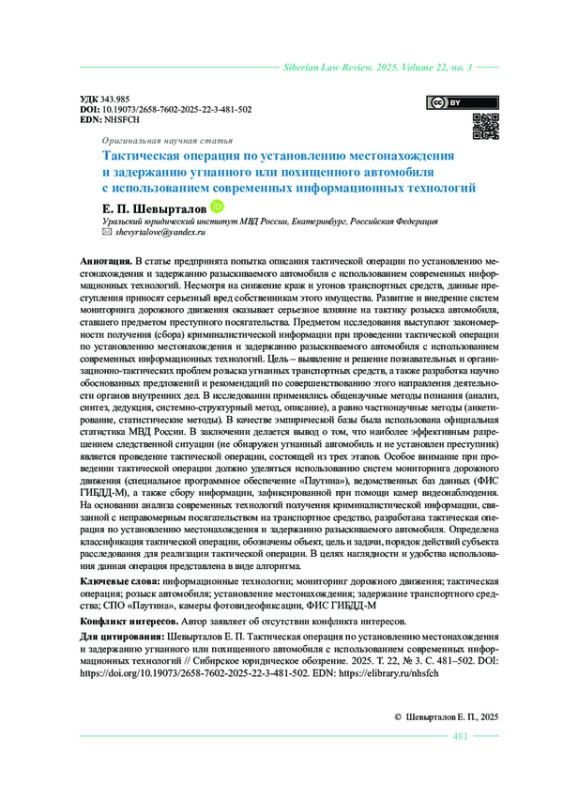 В статье предпринята попытка описания тактической операции по установлению местонахождения и задержанию разыскиваемого автомобиля с использованием современных информационных технологий. Несмотря на снижение краж и угонов транспортных средств, данные преступления приносят серьезный вред собственникам этого имущества. Развитие и внедрение систем мониторинга дорожного движения оказывает серьезное влияние на тактику розыска автомобиля, ставшего предметом преступного посягательства. Предметом исследования выступают закономерности получения (сбора) криминалистической информации при проведении тактической операции по установлению местонахождения и задержанию разыскиваемого автомобиля с использованием современных информационных технологий. Цель – выявление и решение познавательных и организационно-тактических проблем розыска угнанных транспортных средств, а также разработка научно обоснованных предложений и рекомендаций по совершенствованию этого направления деятельности органов внутренних дел. В исследовании применялись общенаучные методы познания (анализ, синтез, дедукция, системно-структурный метод, описание), а равно частнонаучные методы (анкетирование, статистические методы). В качестве эмпирической базы была использована официальная статистика МВД России. В заключении делается вывод о том, что наиболее эффективным разрешением следственной ситуации (не обнаружен угнанный автомобиль и не установлен преступник) является проведение тактической операции, состоящей из трех этапов. Особое внимание при проведении тактической операции должно уделяться использованию систем мониторинга дорожного движения (специальное программное обеспечение «Паутина»), ведомственных баз данных (ФИС ГИБДД-М), а также сбору информации, зафиксированной при помощи камер видеонаблюдения. На основании анализа современных технологий получения криминалистической информации, связанной с неправомерным посягательством на транспортное средство, разработана тактическая операция по установлению местонахождения и задержанию разыскиваемого автомобиля. Определена классификация тактической операции, обозначены объект, цель и задачи, порядок действий субъекта расследования для реализации тактической операции. В целях наглядности и удобства использования данная операция представлена в виде алгоритма.
