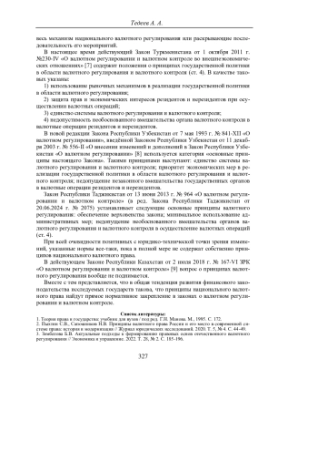 3. Зембатова Б.В. Актуальные подходы к формированию правовых основ отечественного валютного регулирования // Экономика и управление. 2022. Т. 28, № 2. С. 185-196. EDN: AJKOXF