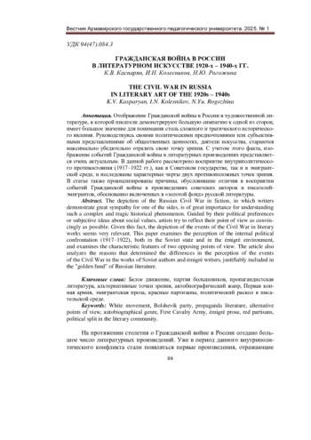 1. Бабичева, Ю. В. Гражданская война в России начала XX века в зеркалах отечественной литературы / Ю. В. Бабичева. - Текст: непосредственный // Вестник Череповецкого государственного университета. - 2012. - № 2. - Том 2. - С. 54-58. EDN: PCDGVR