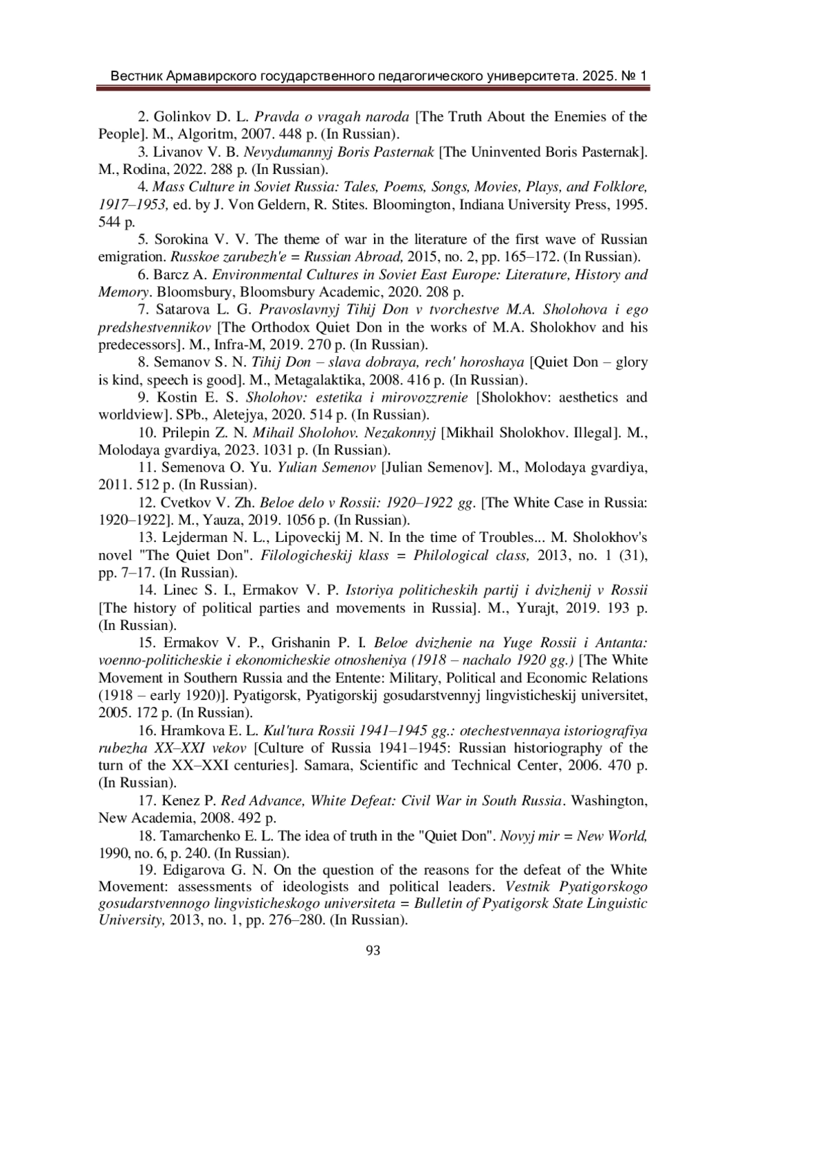 19. Едигарова, Г. Н. К вопросу о причинах поражения Белого движения: оценки идеологов и политических лидеров / Г. Н. Едигарова. - Текст: непосредственный // Вестник Пятигорского государственного лингвистического университета. - 2013. - № 1. - С. 276-280.